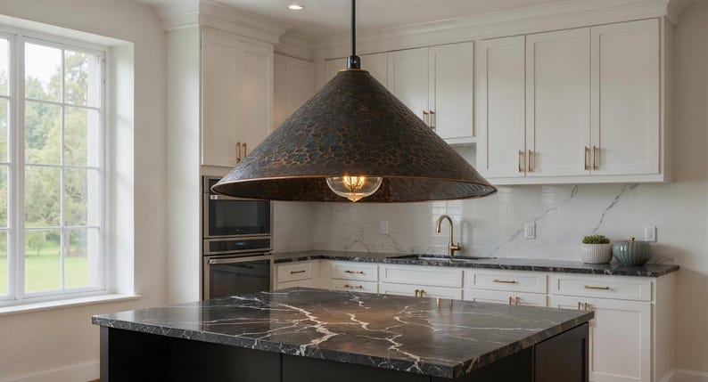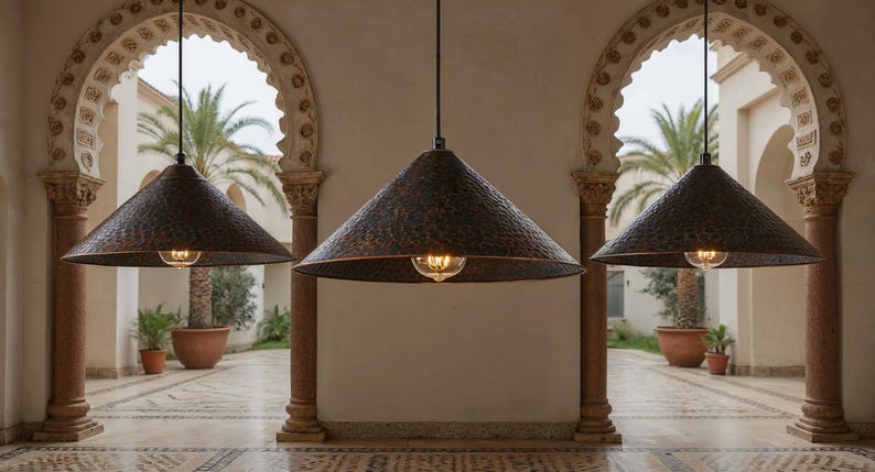 Bring warmth and character to your space with this handcrafted dome pendant light, featuring a rich patina copper finish. Perfect for kitchens, dining areas, or living spaces, this rustic industrial lamp blends vintage charm with modern design. Each lamp is meticulously crafted, making every piece unique with natural variations in tone and texture. Ideal for adding a statement piece to your décor or enhancing your Moroccan-inspired interiors.