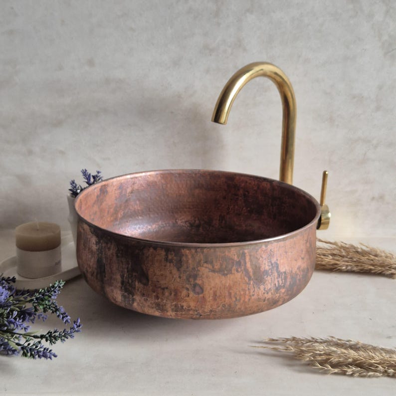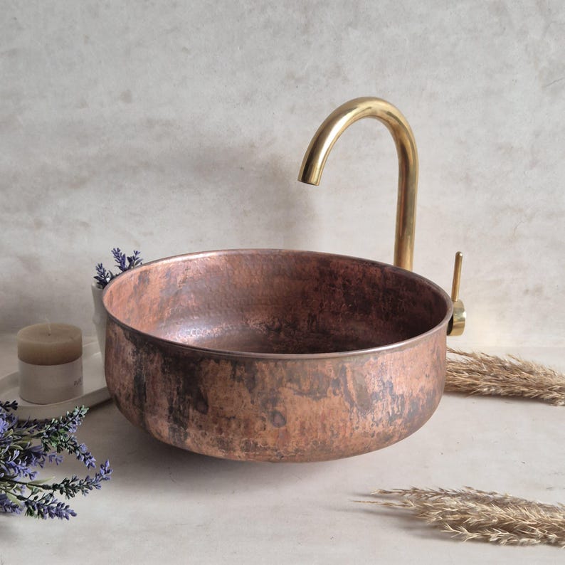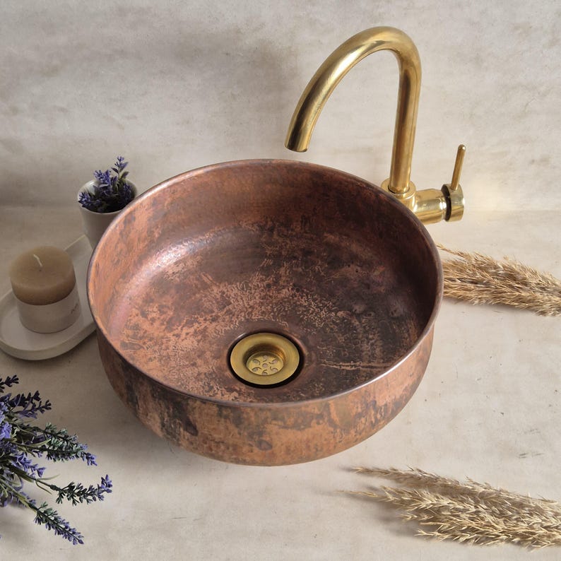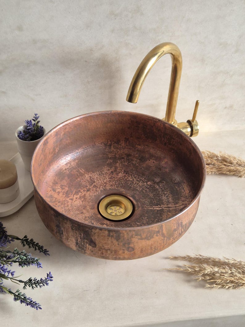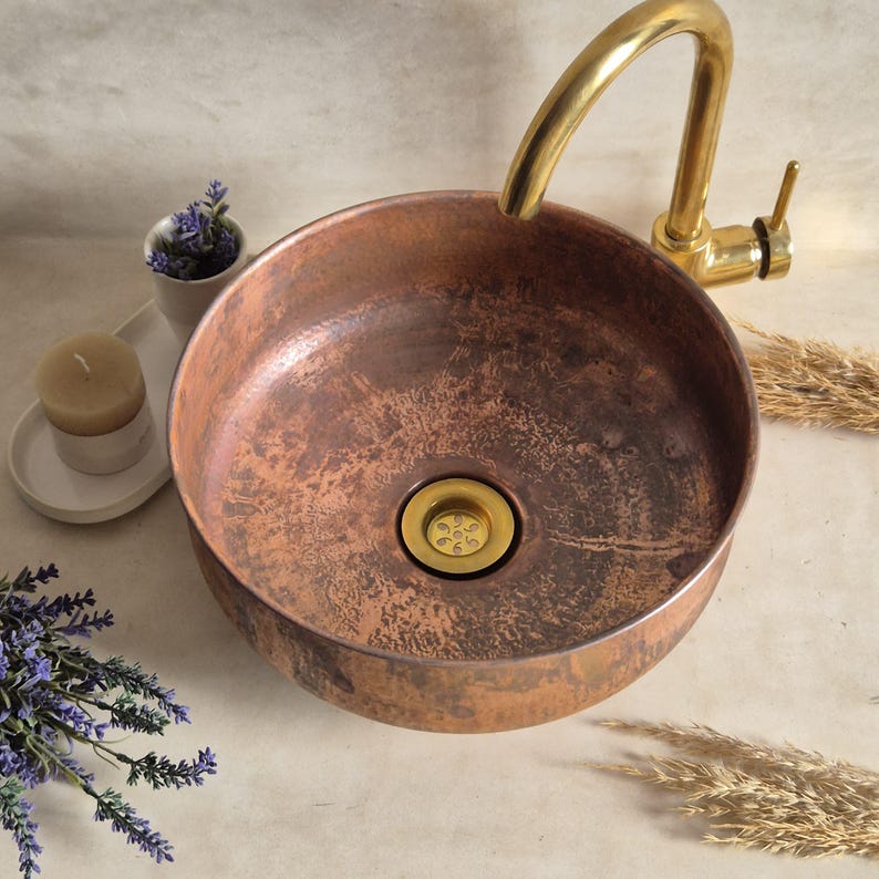 Elevate your bathroom or powder room with this stunning handmade copper sink. Crafted with precision and care, this round vessel sink features a unique textured pattern that reflects light beautifully, adding a touch of luxury and sophistication to any space. The antique brass finish gives it a warm, vintage charm, perfect for rustic, bohemian, or modern farmhouse décor styles.