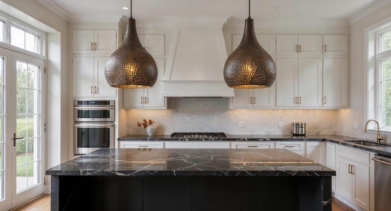 Moroccan Dome Pendant Light – Handmade Black Brass Ceiling Lamp with Pierced Holes, Boho Kitchen Island Lighting, Rustic Chandelier Fixture