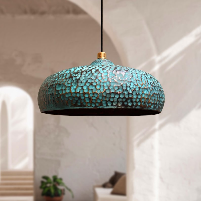 Handmade Blue Patina Brass Pendant Light - Hammered Dome Kitchen Lighting