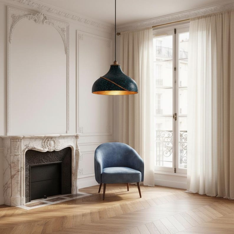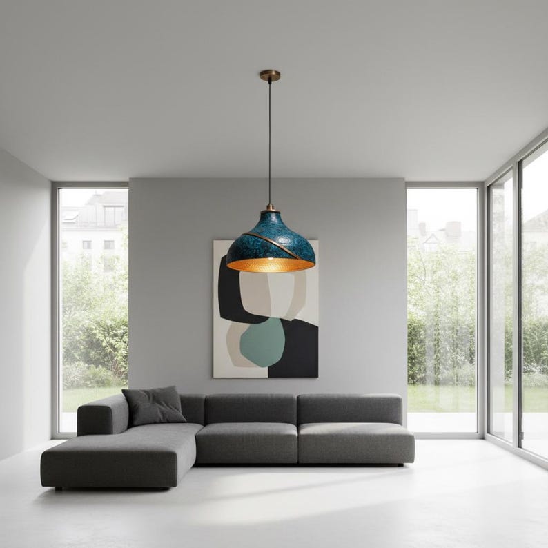 Elevate your interior with this handmade copper pendant light, featuring a deep blue verdigris patina and a distinctive decorative band detail.