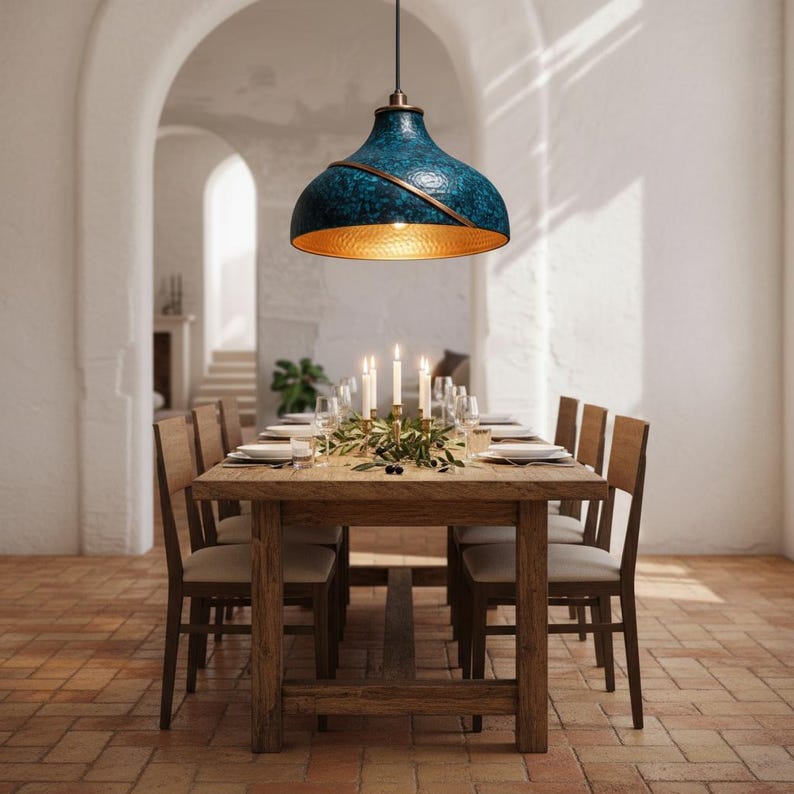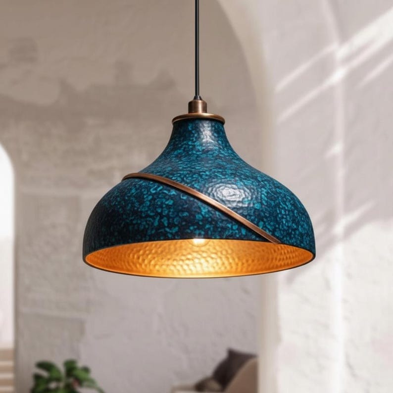 Handmade Blue Verdigris Copper Pendant Light with Decorative Band – Modern Rustic Ceiling Lamp
