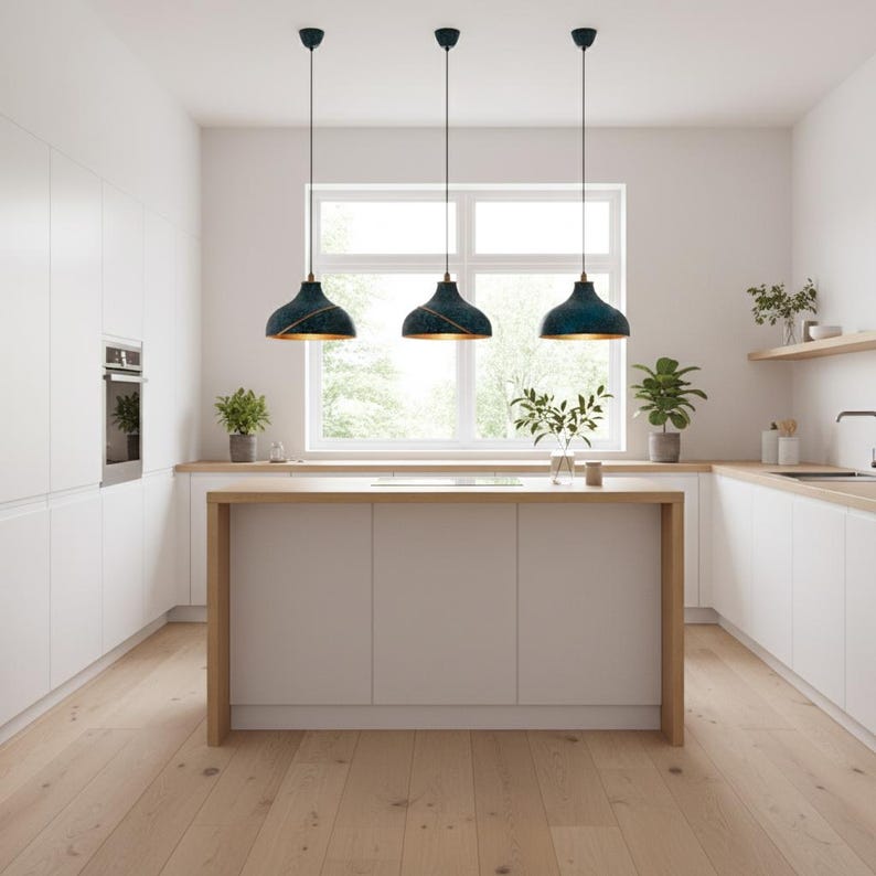 The warm hammered copper interior reflects light beautifully, producing a soft golden glow that enhances any space. Perfect for kitchen islands, dining areas, or modern interiors, this pendant blends artisan craftsmanship with contemporary elegance.
