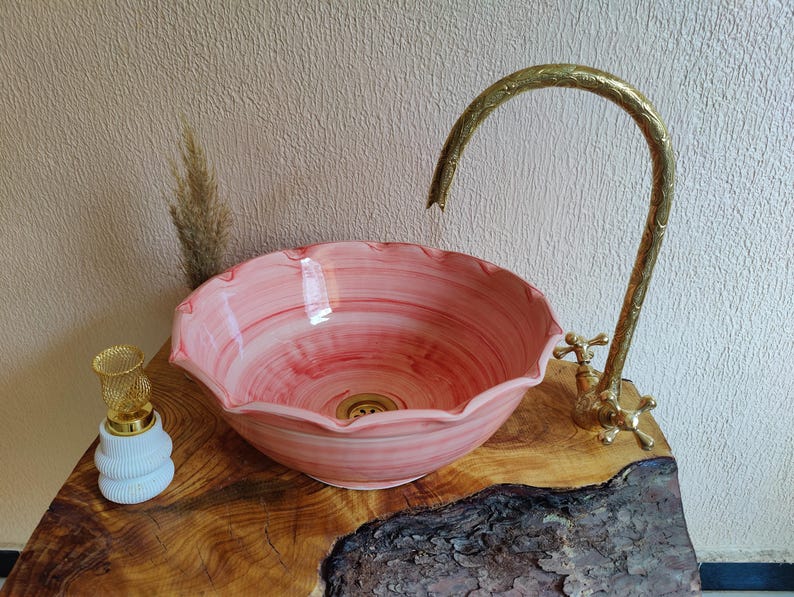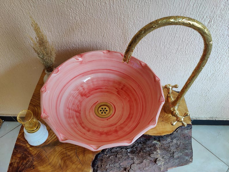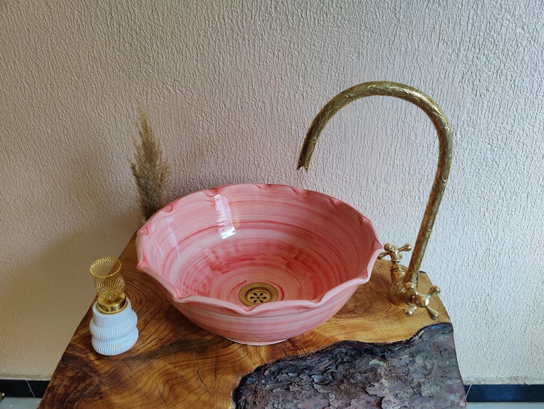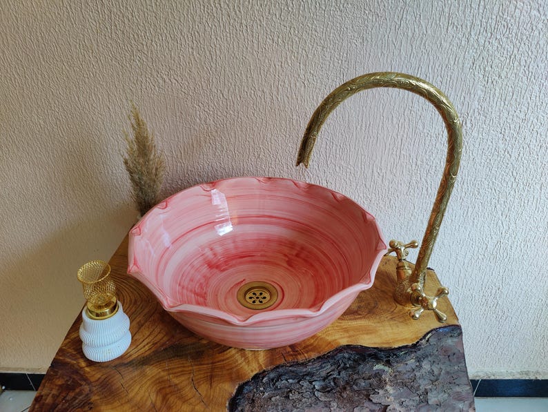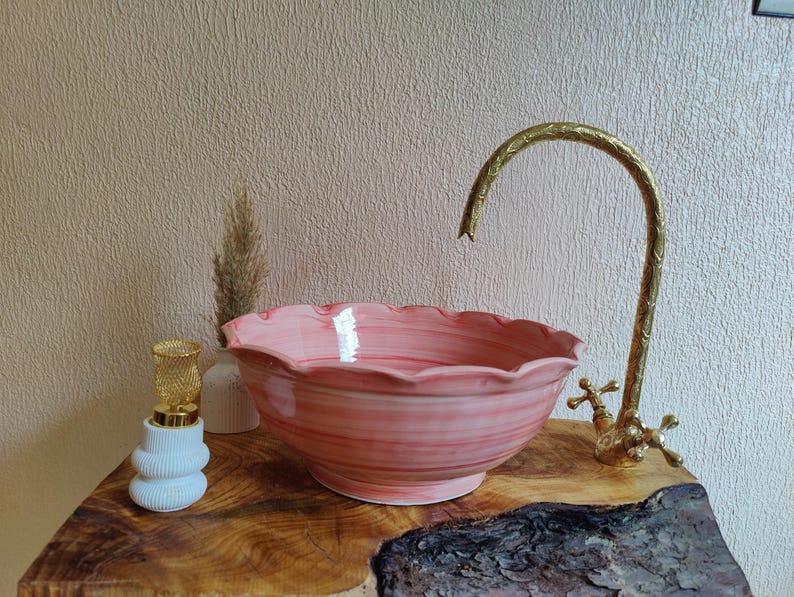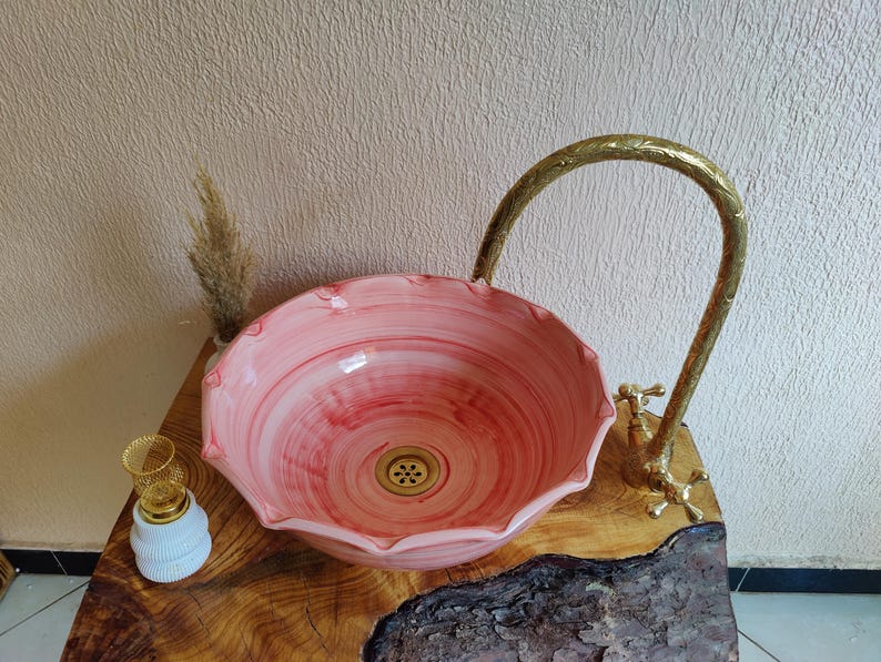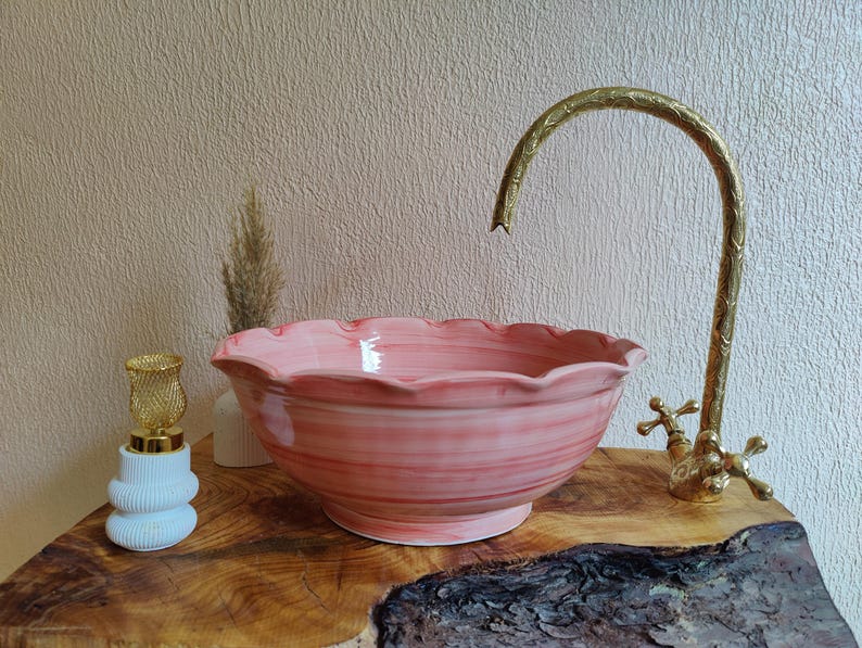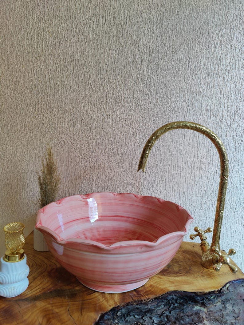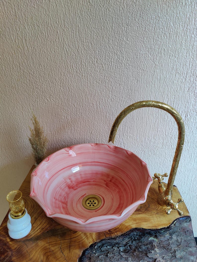 Add a bold and artistic touch to your bathroom with this handmade Moroccan ceramic sink in a stunning soft pink glaze. Crafted in Fez by master artisans, this sink features a unique flower-shaped design that stands out beautifully in both modern and boho-inspired interiors.