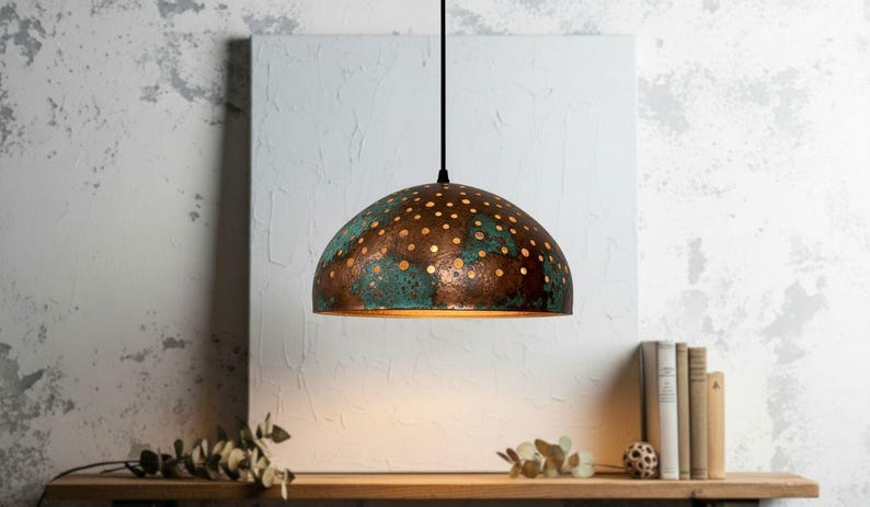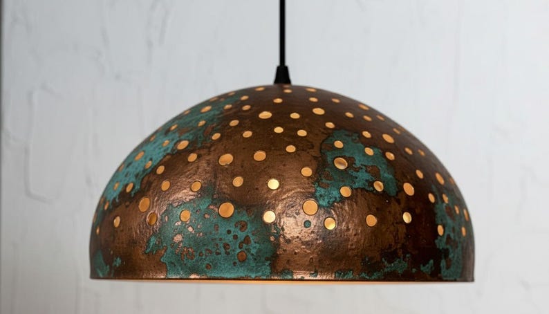 Handmade Copper Dome Pendant Lamp: green patina Rustic Light