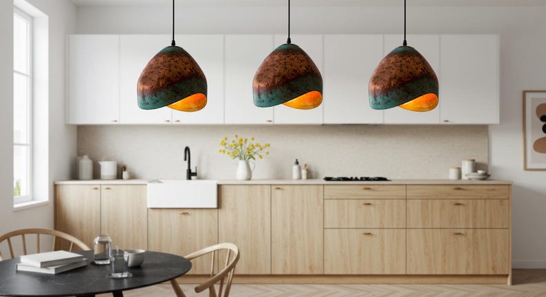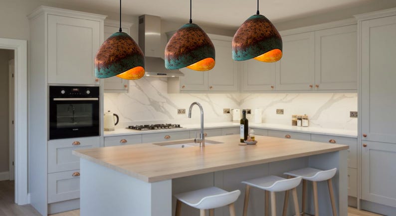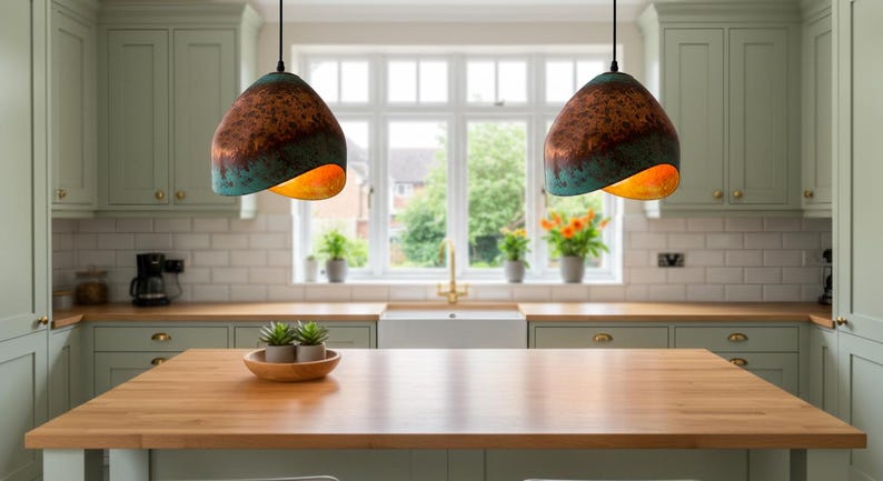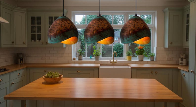 Handmade Copper Dome Pendant Light: Green Patina Rustic Farmhouse Lighting