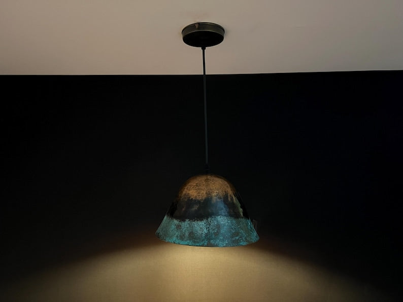 Bring warmth and character to your space with this handmade copper pendant lamp, finished in a unique green patina dome design. Each piece is carefully crafted by artisans, giving it a rustic yet modern look that adds depth and personality to any interior.