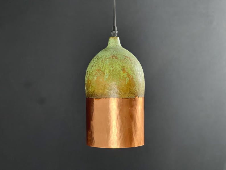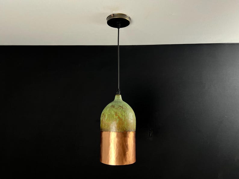 Elevate your home décor with this handmade copper pendant lamp, designed with a striking two-tone finish. The top half features a textured green patina for a rustic and artistic feel, while the bottom half showcases the natural polished copper for a modern, warm glow.