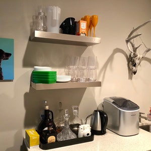 Shelves are handmade, allowing for custom sizes and shapes upon request.