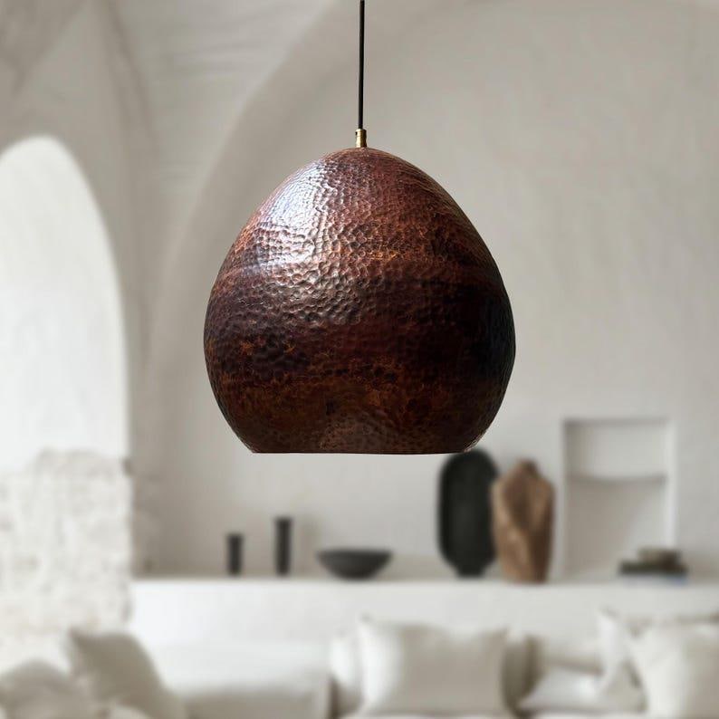 This ceiling lamp is hand-hammered by skilled artisans in Morocco using high-quality copper or brass. Its intricate perforated design creates mesmerizing shadow patterns on your walls and ceiling when lit, turning any room into a warm and inviting haven.