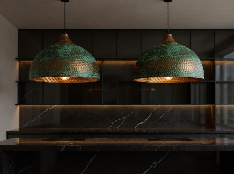 โจ The rich contrast between the polished copper base and the oxidized green patina top adds character and depth to the lamp, casting a warm, elegant glow. Ideal for kitchen islands, dining rooms, cafes, or entryways.