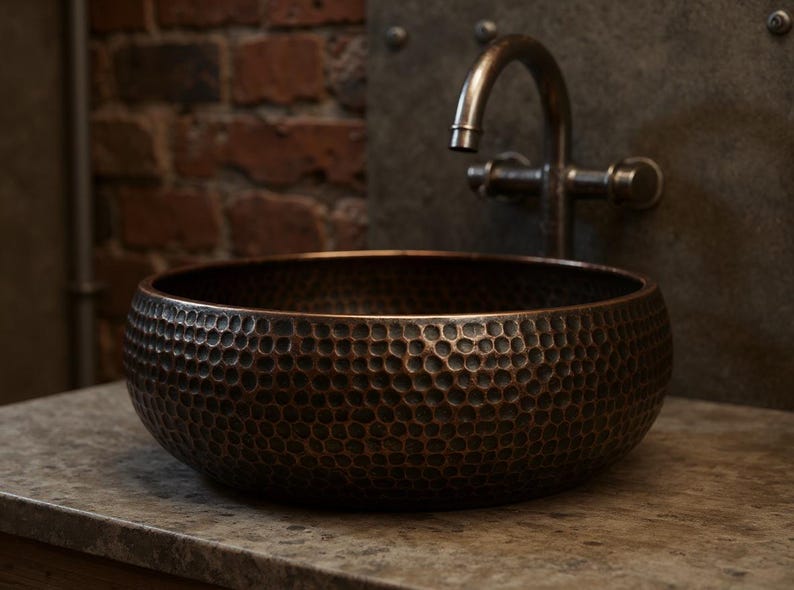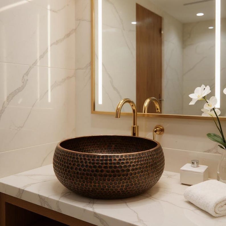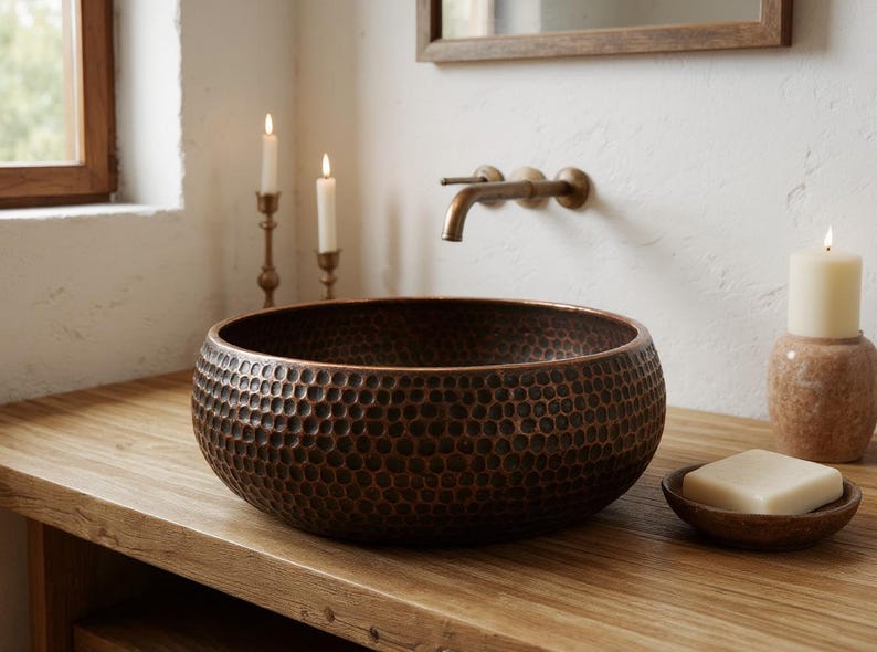 The hammered copper surface reflects light beautifully, while its natural finish develops a unique patina over time — ensuring every sink is one of a kind.