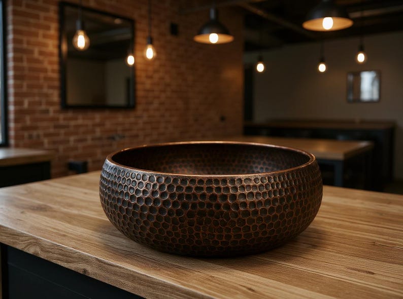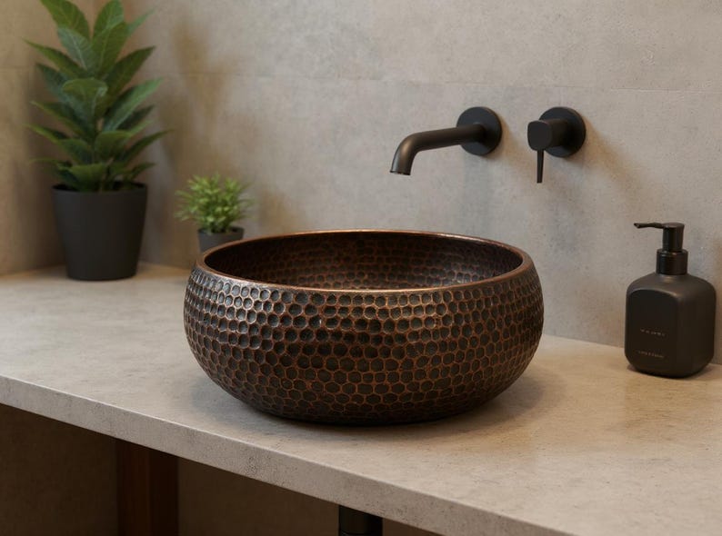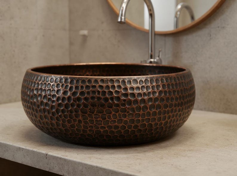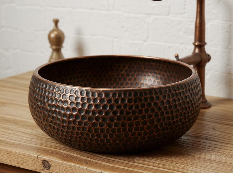 Round Hammered Copper Sink | Handmade Honeycomb Vessel Basin | Rustic Farmhouse Vanity Bowl | Moroccan Copper Bathroom Sink