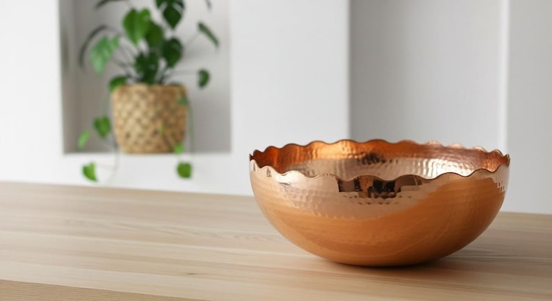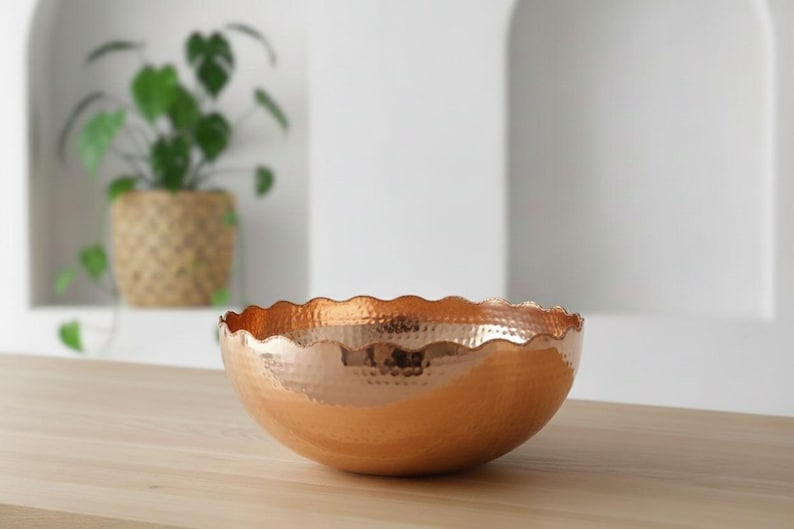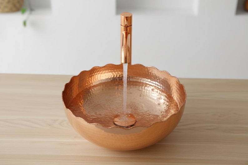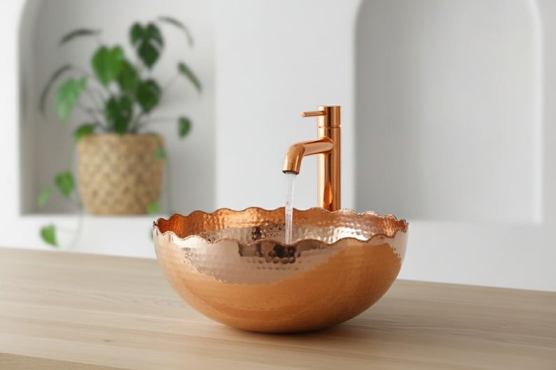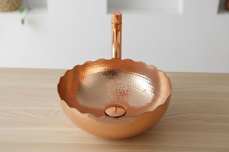 Transform your bathroom or kitchen into a masterpiece with this handmade copper sink. Crafted from premium copper, it features a hand-hammered interior for a unique texture and a smooth polished finish, while the exterior boasts a stunning patina inspired by traditional Moroccan artistry.