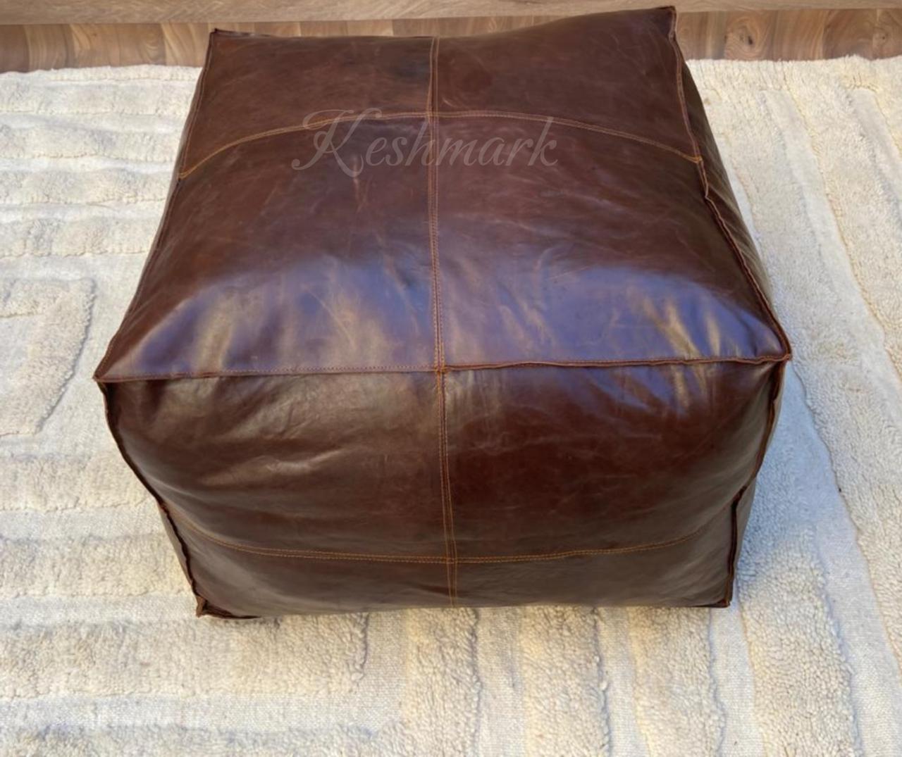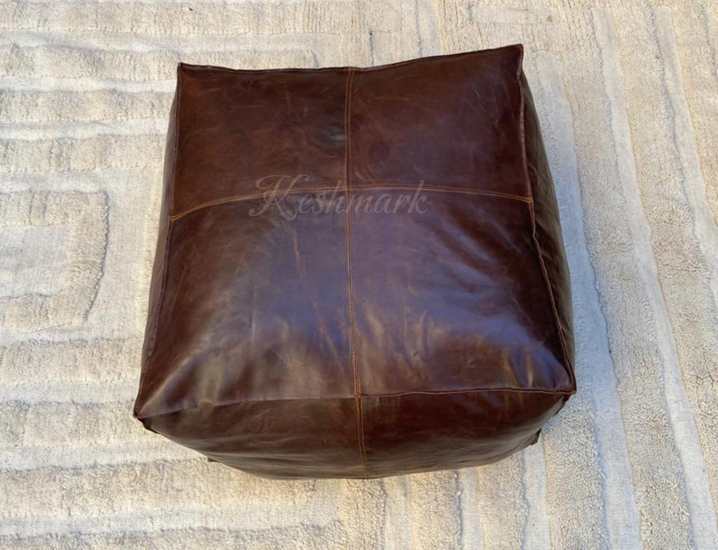 Handmade Leather Pouf – 24x24x18 Inches Brown Moroccan Ottoman, Genuine Leather Footstool, Boho Living Room Floor Cushion