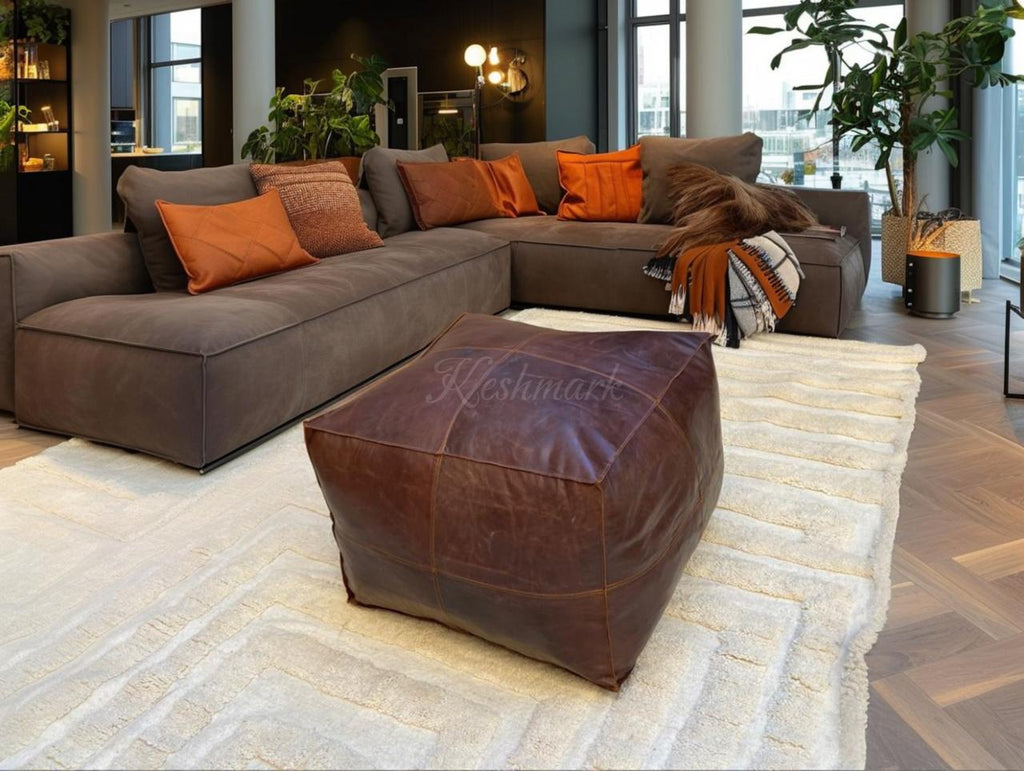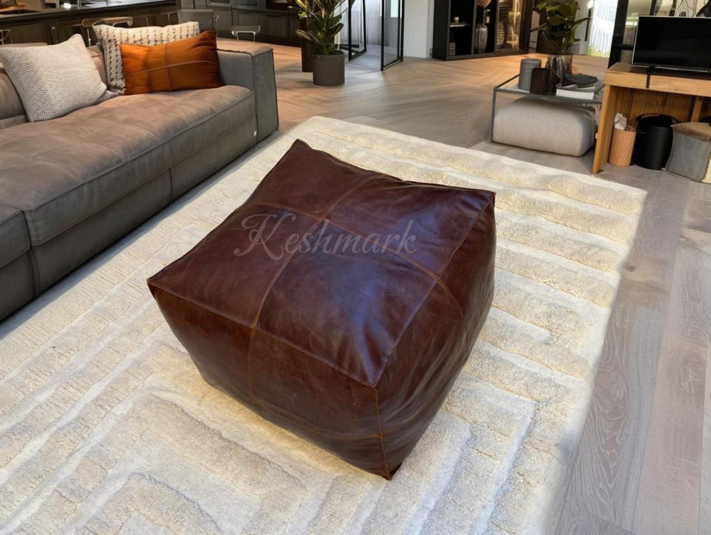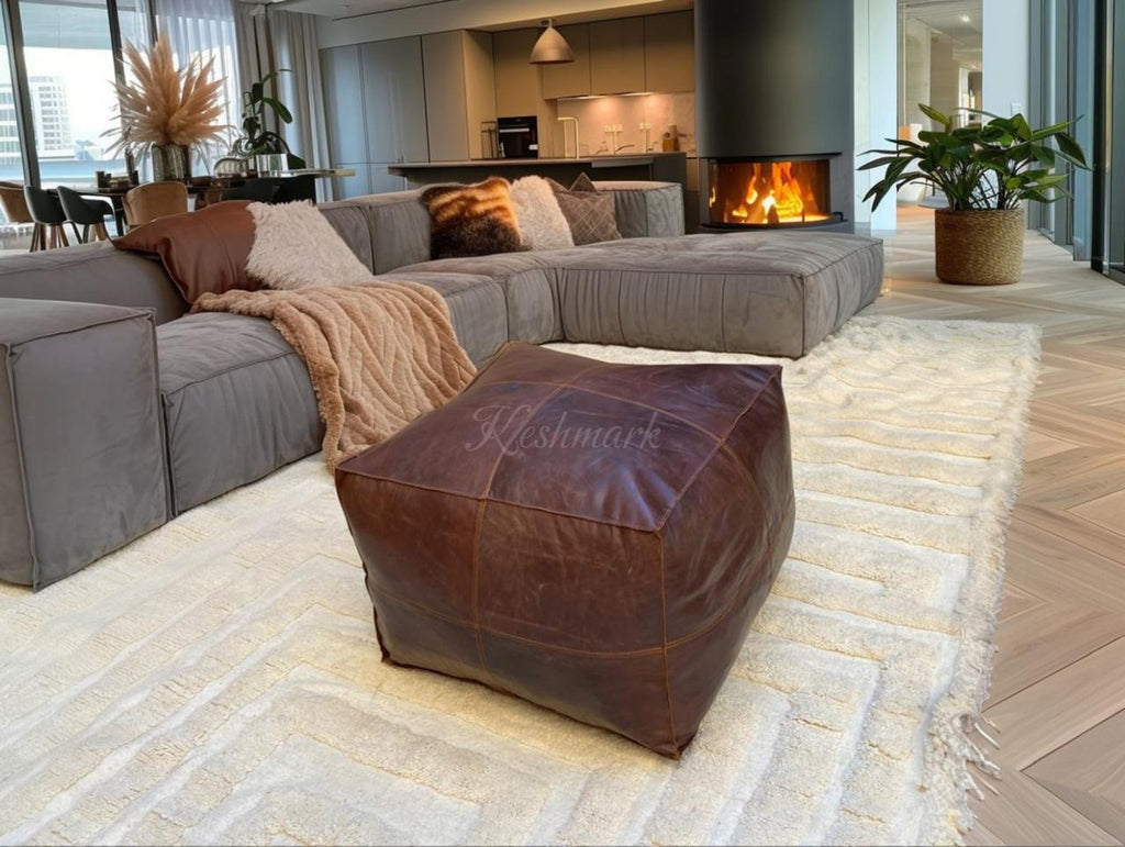 Bring the warmth and craftsmanship of Morocco into your home with this Handmade Leather Pouf, expertly made from 100% genuine full-grain leather by skilled artisans in Marrakesh.