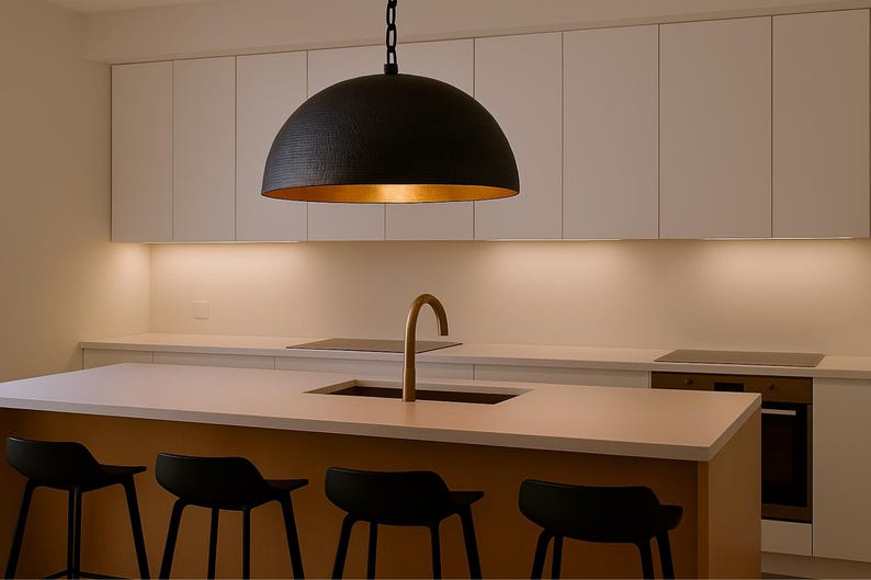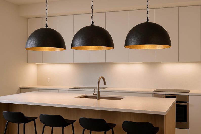 Bring a bold, luxurious touch to your home with this hand-hammered Moroccan brass dome pendant light, handmade in Marrakech by Keshmark Workshop. Featuring a sleek black exterior and a radiant gold interior, this ceiling lamp creates a dramatic contrast while casting warm, enchanting reflections through its intricate hammered floral pattern. Perfect for use as a kitchen island pendant, dining room chandelier, or living room ceiling light, it blends Moroccan elegance with modern boho style.
