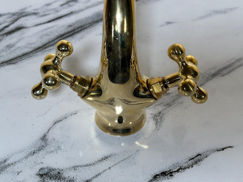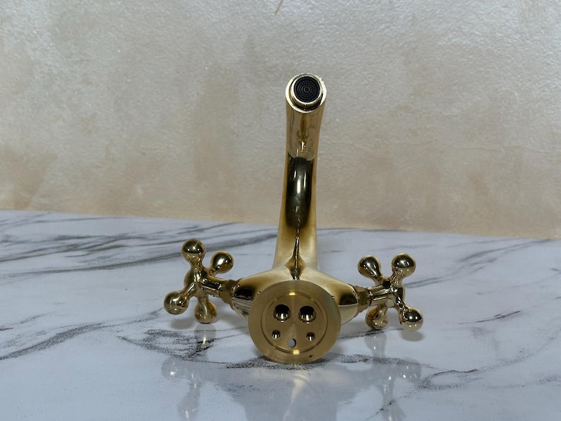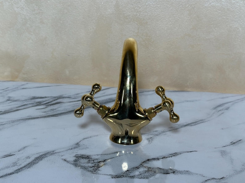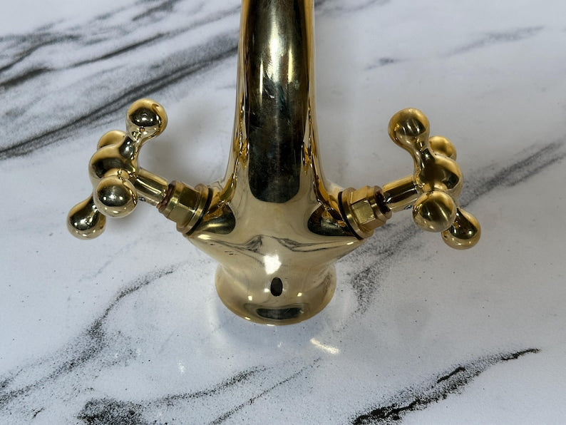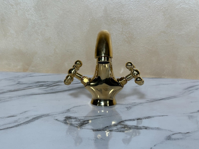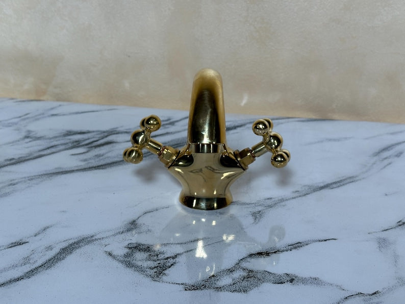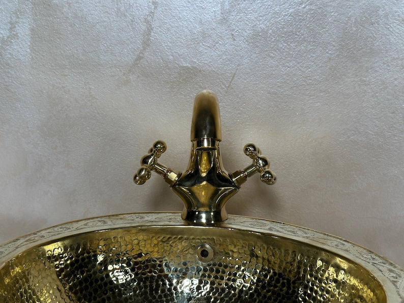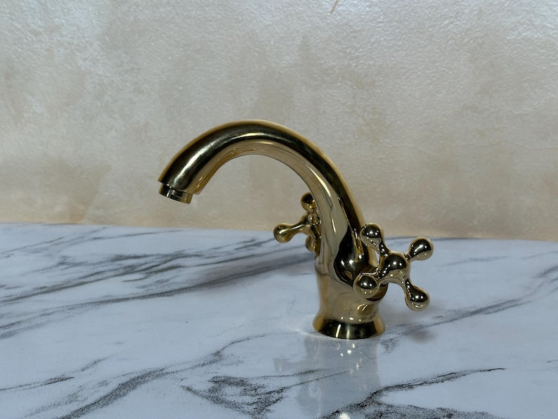 🚿 Bring timeless elegance to your bathroom with this handcrafted Moroccan brass faucet, designed in a vintage-inspired shape with two beautifully sculpted cross handles and a tall arched spout. Each piece is handmade by skilled artisans in Marrakesh using solid brass—not brass-plated metal—for durability and authenticity. The design blends Moroccan charm with classic vintage appeal, making it the perfect choice for a vanity faucet, rustic bathroom fixture, or deck-mount sink tap.