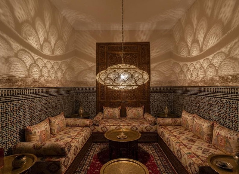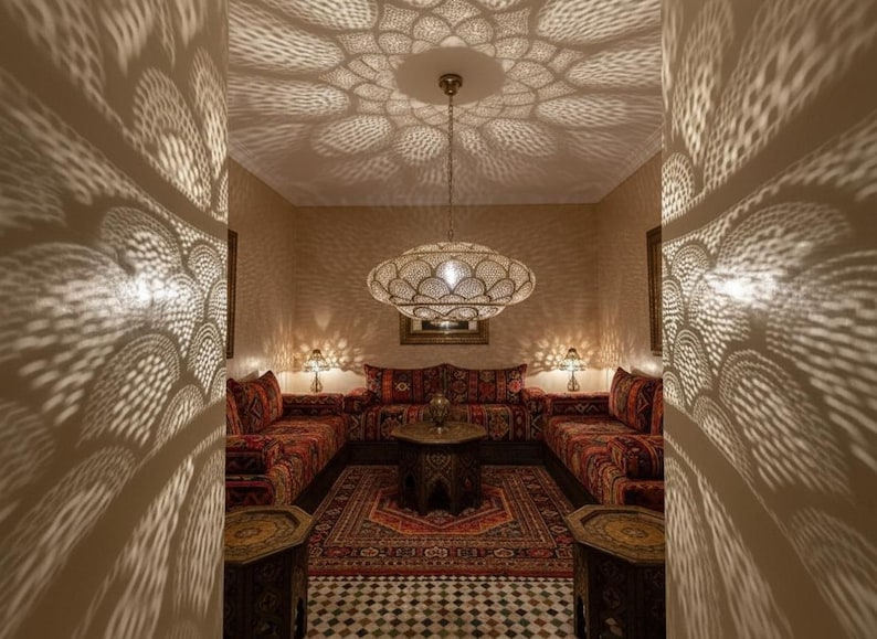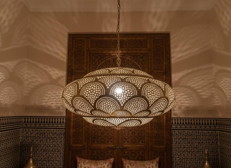 Simple Moroccan pendant lamp. A stunning Moroccan style hand-made ceiling light fixture- a pendant lamp is designed to enhance the exotic beauty of your home decor. Exclusive custom lighting designs from Arabian Home Décor will ensure that this Moroccan piece of art will complement your existing décor and completely enhance the ambiance by filling in the portion of darkness while leaving the remaining area soothing and serene