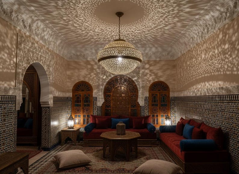 Simple Moroccan pendant lamp. A stunning Moroccan style hand-made ceiling light fixture- a pendant lamp is designed to enhance the exotic beauty of your home decor. Exclusive custom lighting designs from Arabian Home Décor will ensure that this Moroccan piece of art will complement your existing décor and completely enhance the ambiance by filling in the portion of darkness while leaving the remaining area soothing and serene
