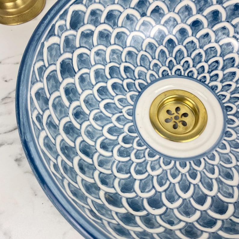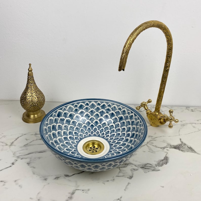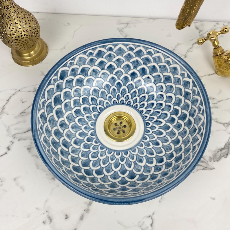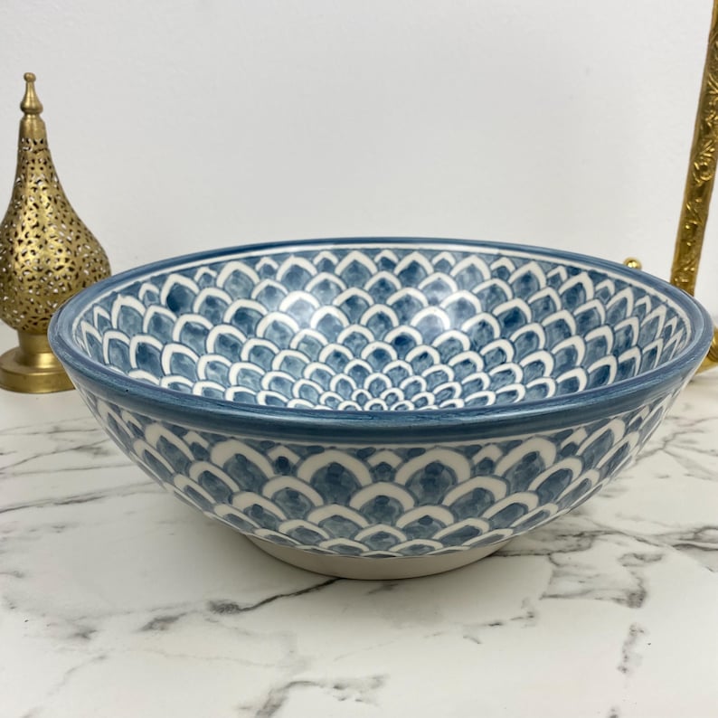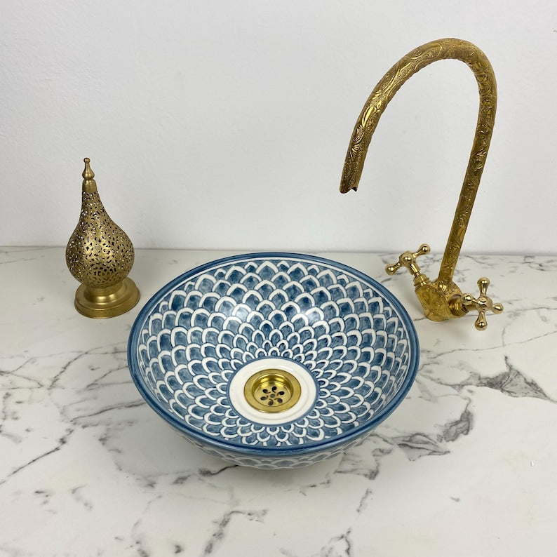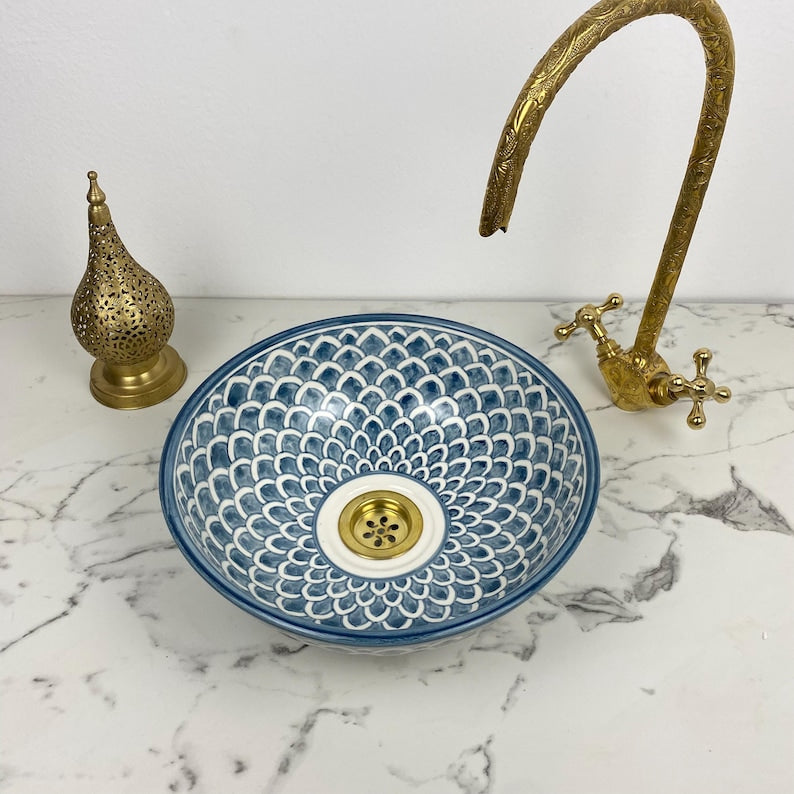 Introduce timeless style to your space with our Handmade Moroccan Modern Blue Design Sink. Whether placed as a striking countertop basin or set into your vanity, this elegant piece brings a harmonious mix of tradition and modern design to your bathroom.