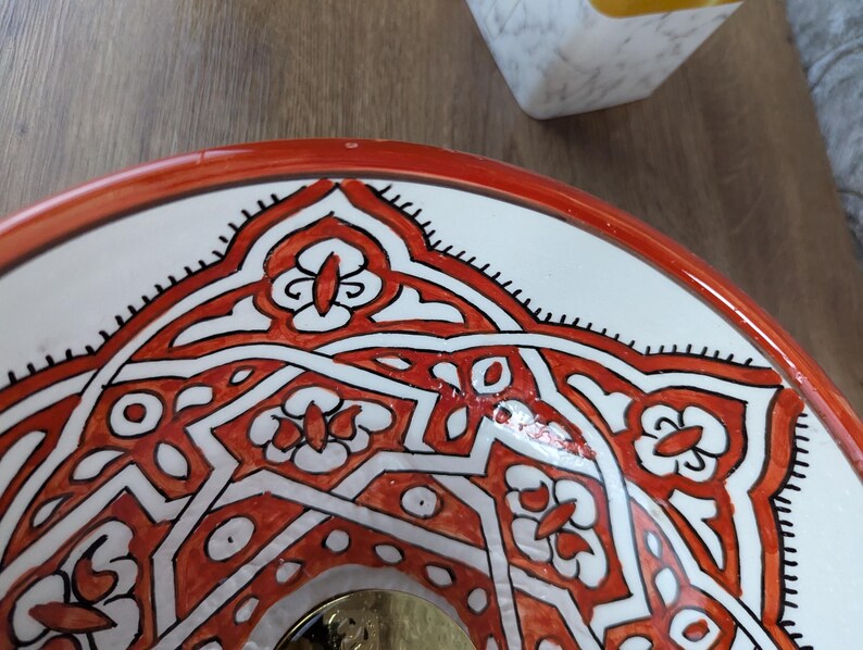 This handmade ceramic sink features an elegant, round basin with intricate patterns on a white background, reminiscent of traditional Moroccan or Mediterranean designs.