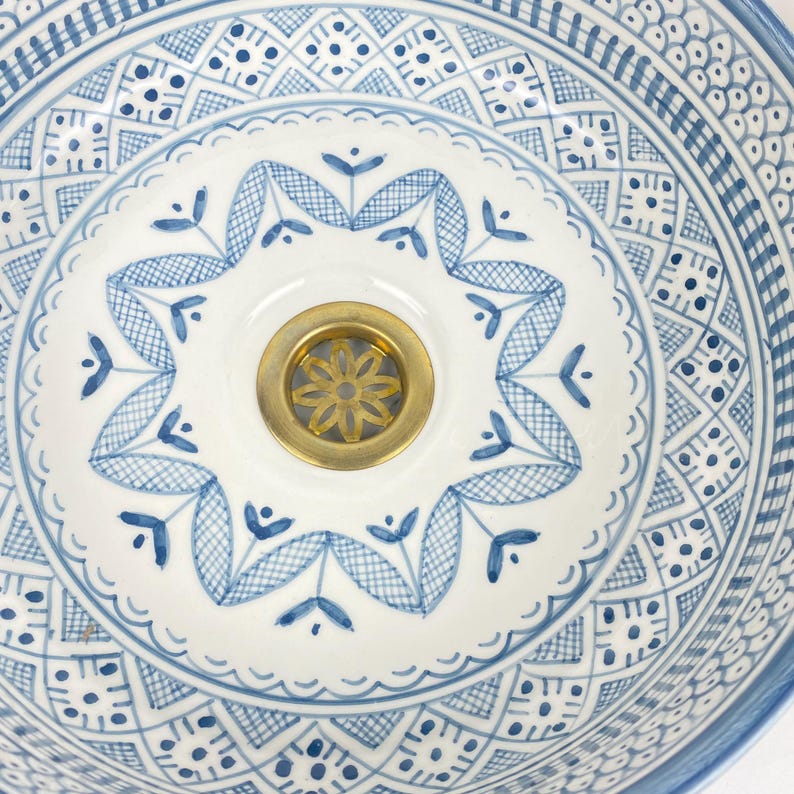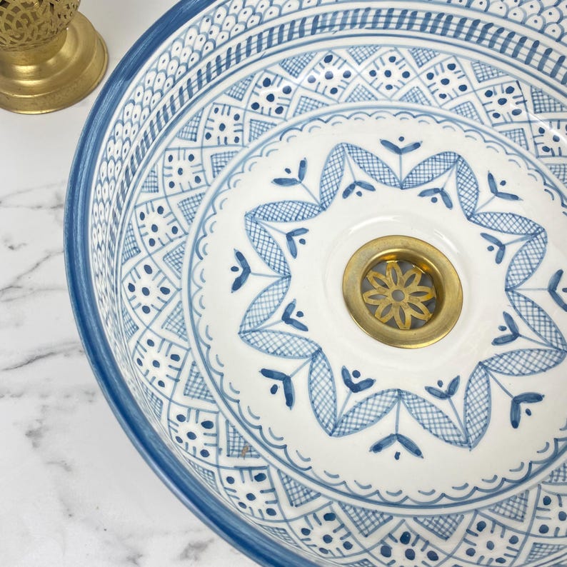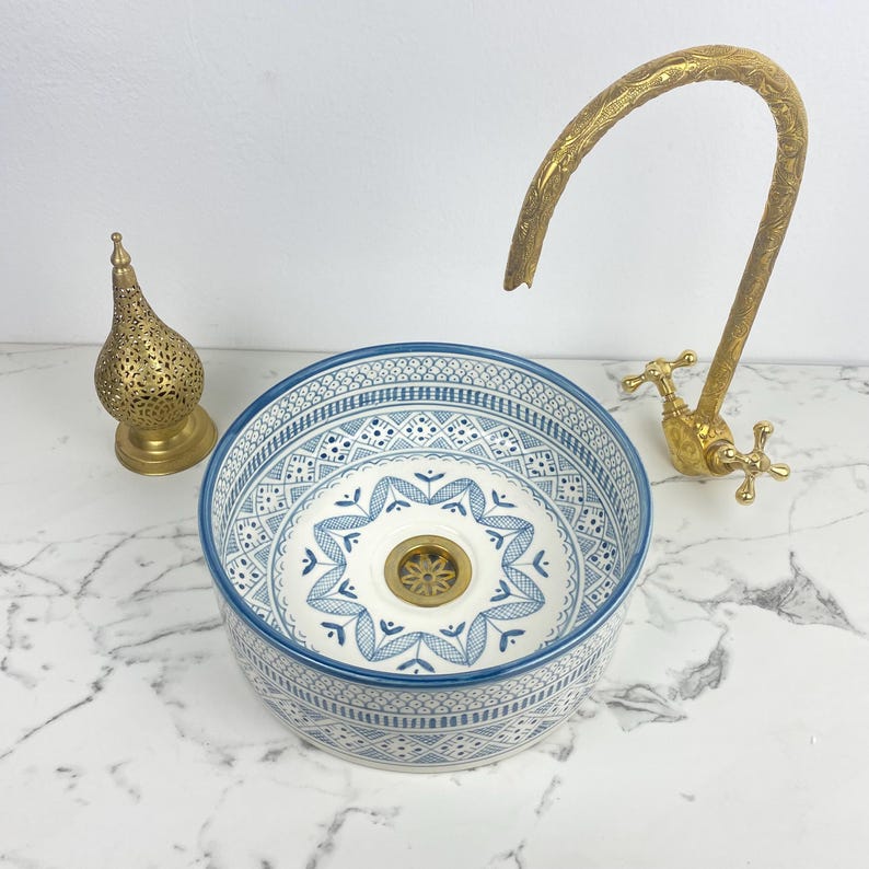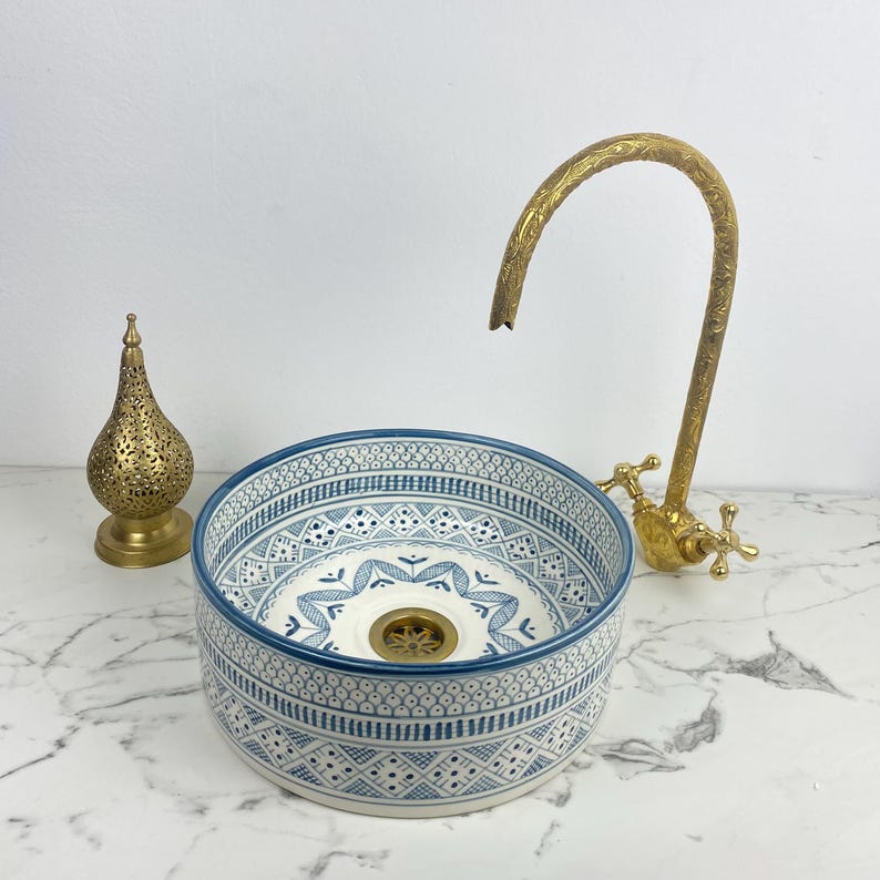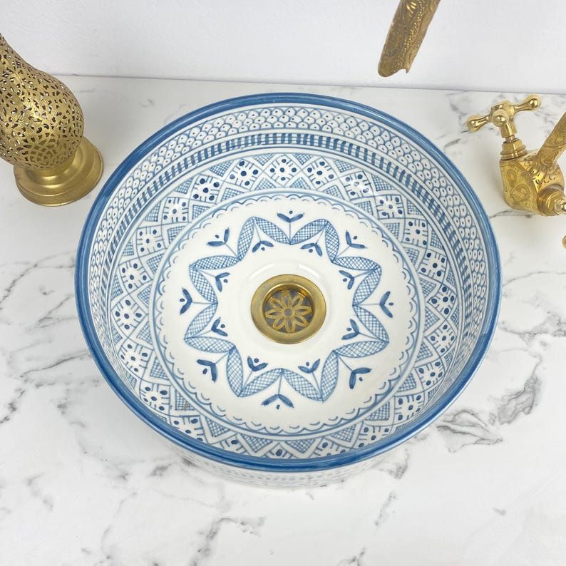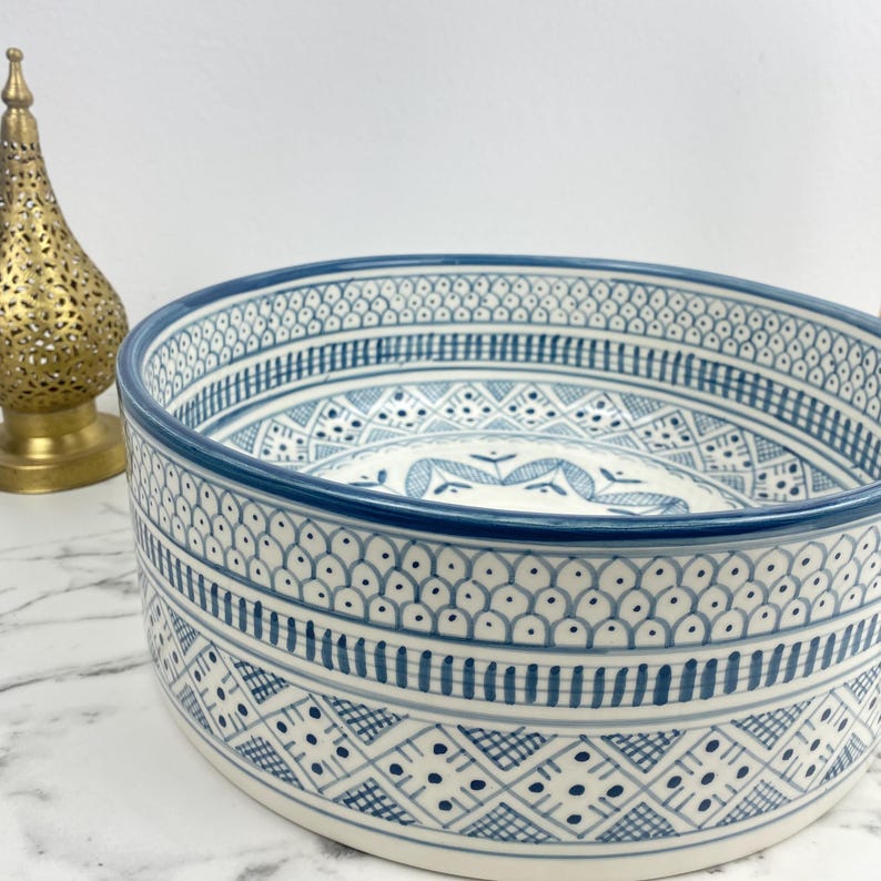 Handmade Moroccan Ceramic Sink, Round Vessel Basin, Blue and White Pattern, Bathroom Vanity Bowl