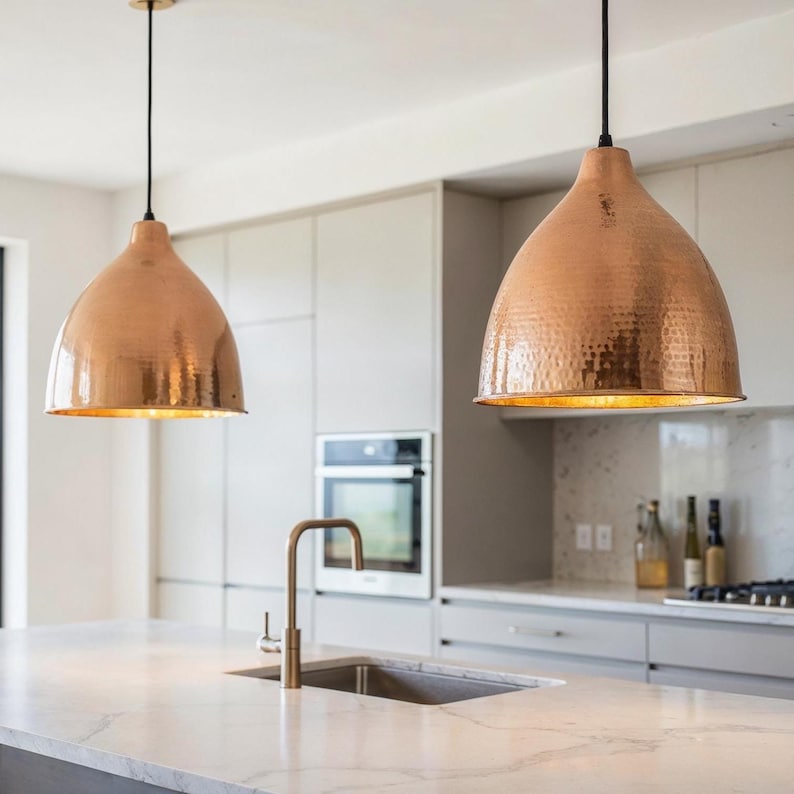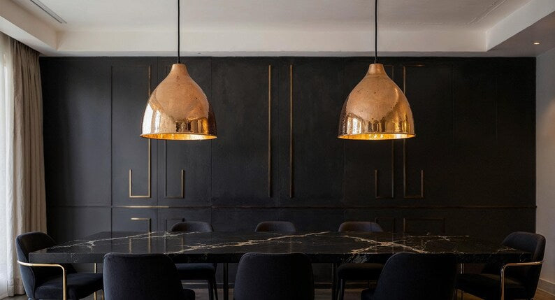 Bring warmth and character to your space with this handcrafted dome pendant light, featuring a rich patina copper finish. Perfect for kitchens, dining areas, or living spaces, this rustic industrial lamp blends vintage charm with modern design. Each lamp is meticulously crafted, making every piece unique with natural variations in tone and texture. Ideal for adding a statement piece to your décor or enhancing your Moroccan-inspired interiors.