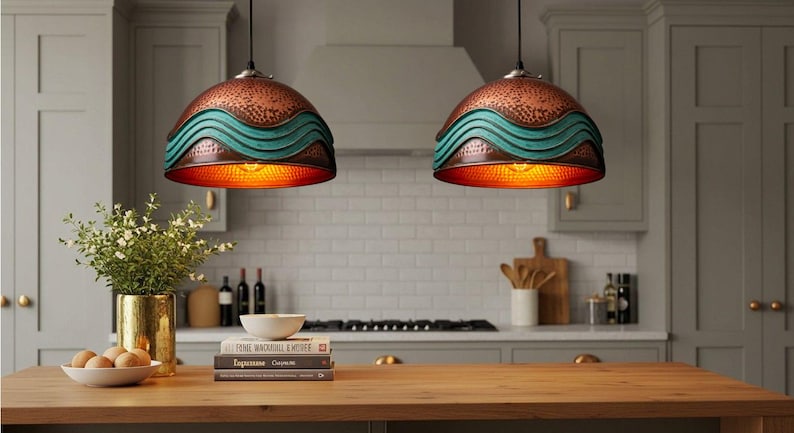 Handmade Moroccan Copper Pendant Light: Green Patina Industrial Hanging Lamp