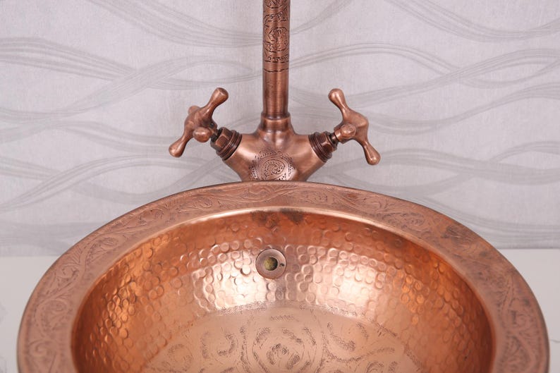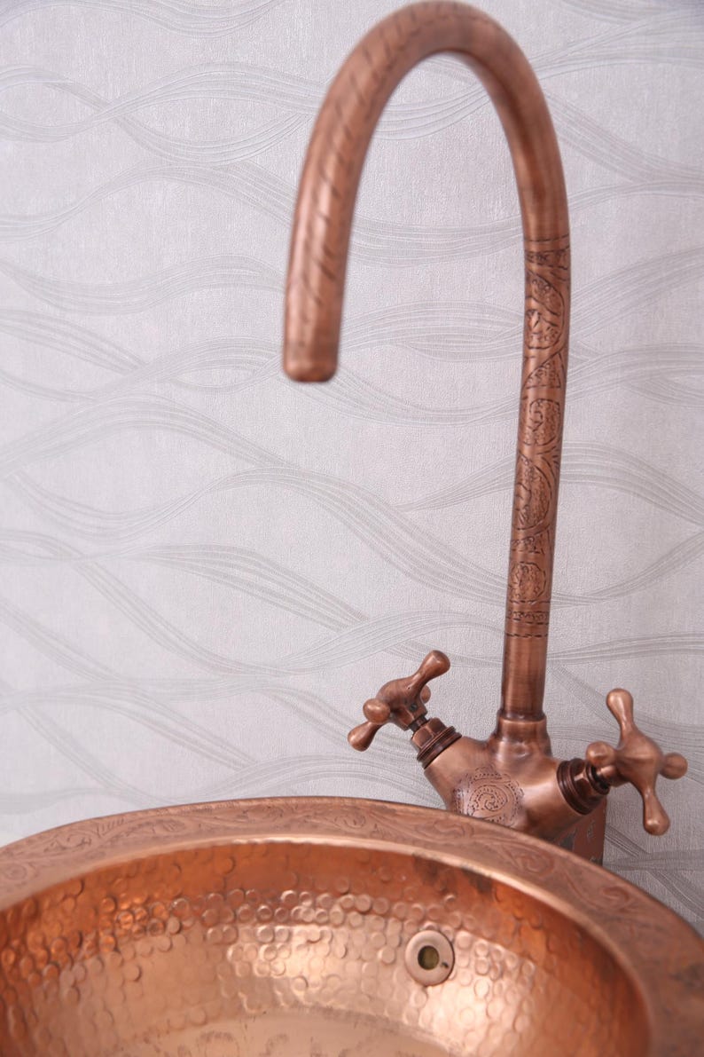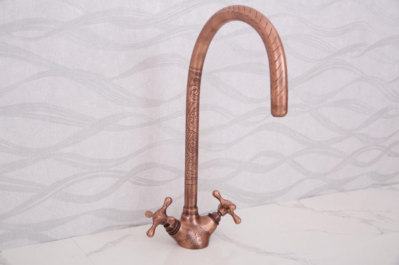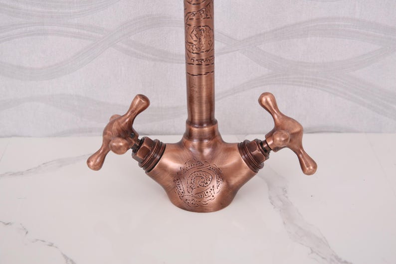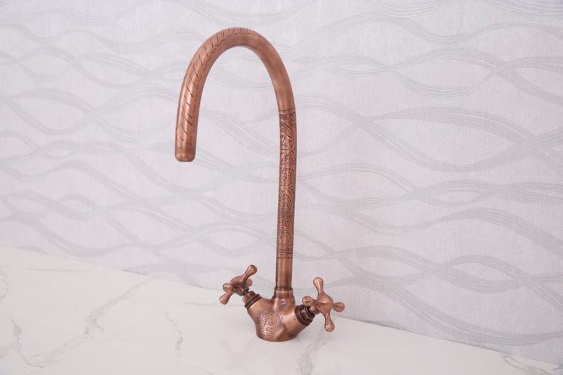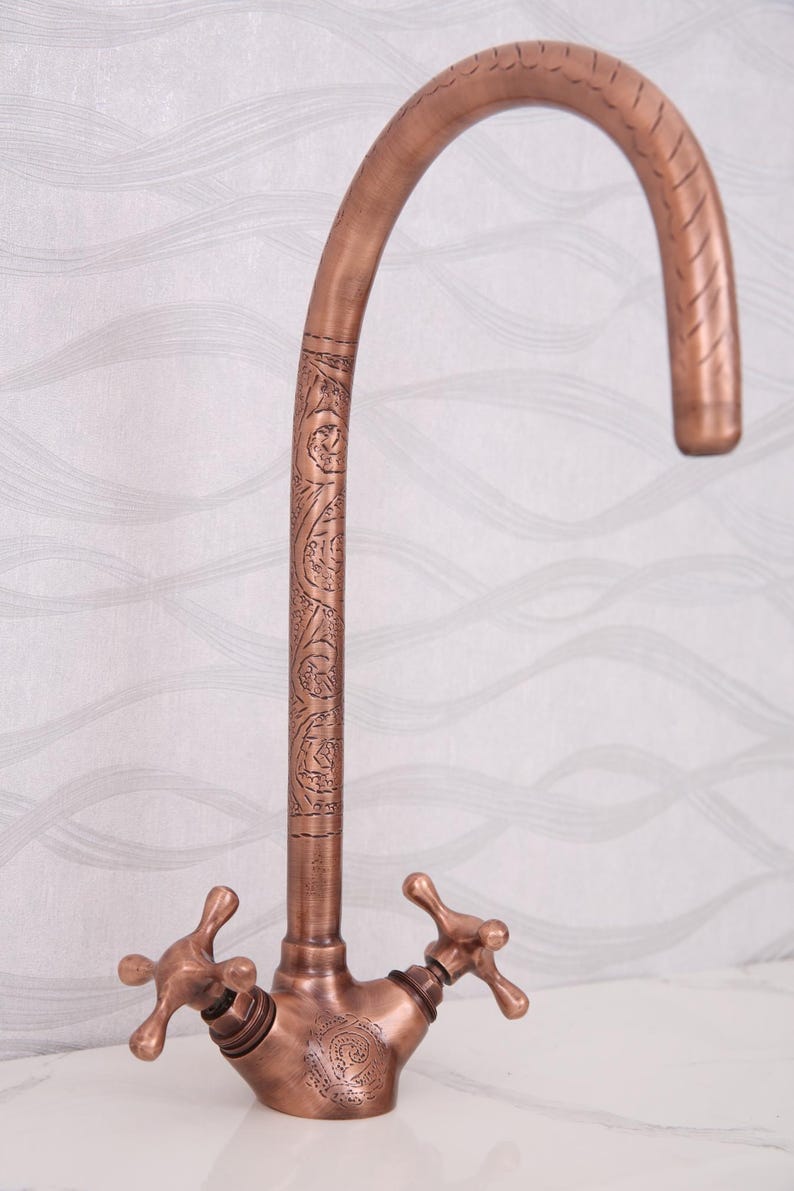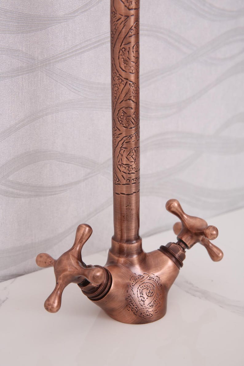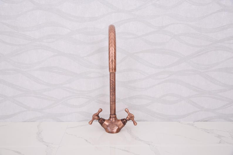 Elevate your bathroom or kitchen with this handmade Moroccan hammered brass faucet, a stunning blend of traditional artistry and functional design. Crafted from solid brass with a warm copper-toned finish, this faucet features a distinctive hammered texture, curved spout, and dual cross handles—a true nod to vintage elegance with a Moroccan soul.
