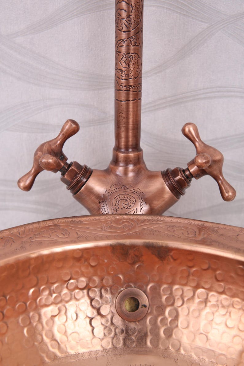 Handmade Moroccan Hammered Brass Faucet – Vintage Copper Bathroom Tap – Dual Handle Sink Fixture – 32cm Tall Artisan Hardware