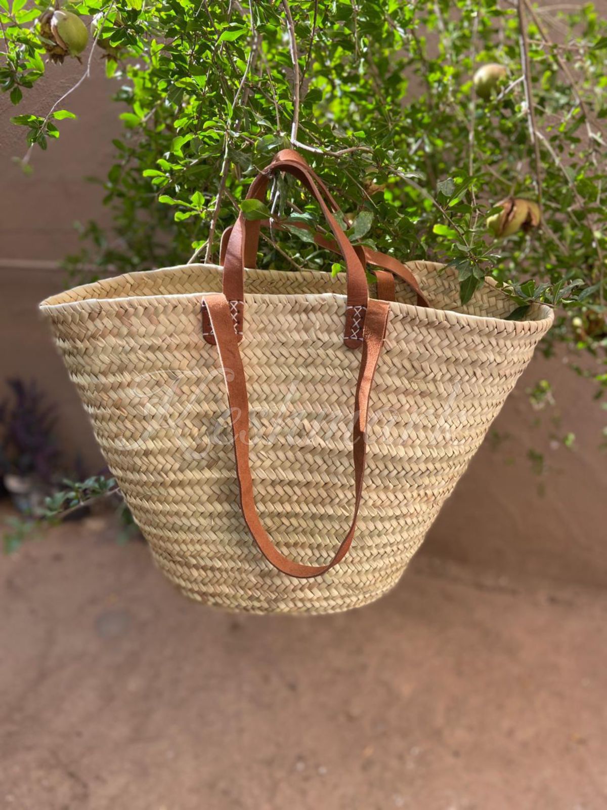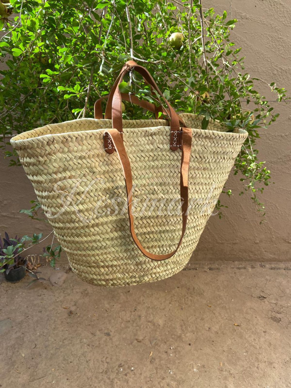This elegant straw tote bag is handwoven in the souks of Marrakech, Morocco, from natural palm leaves and finished with genuine leather handles. Each basket is made using traditional weaving techniques passed down through generations, resulting in a bag that is both beautiful and durable.