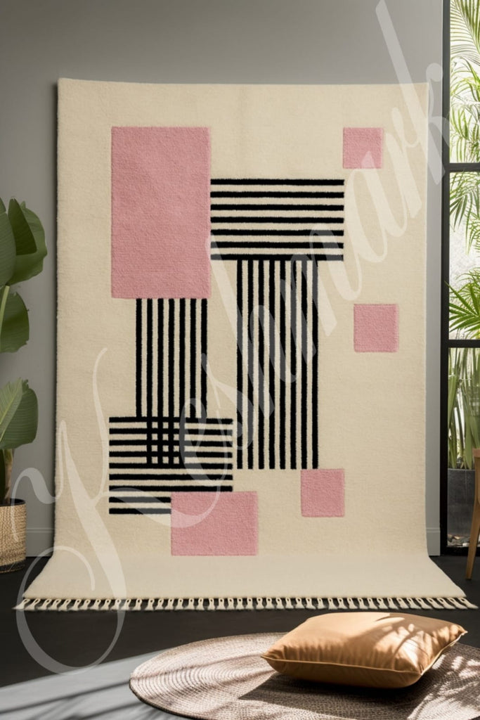 Handmade Moroccan Wool Rug – Modern Abstract Geometric Design | Large Berber Area Rug | Minimalist Neutral Carpet