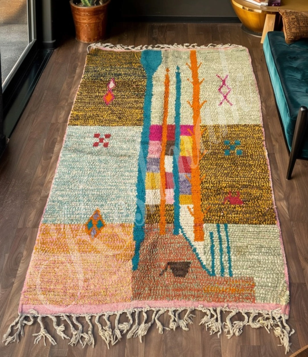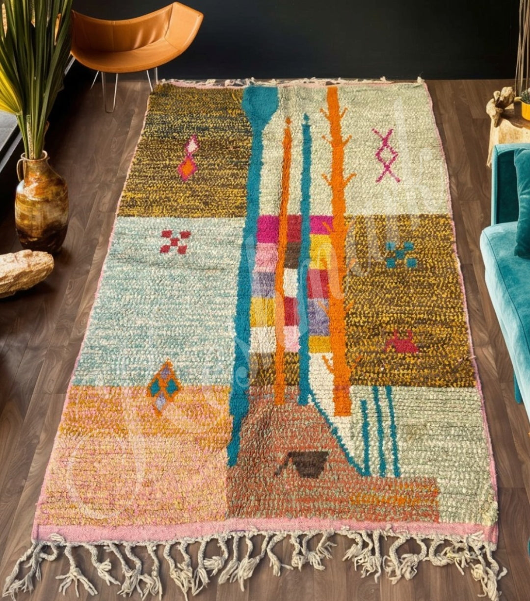Woven from 100% natural wool, this rug is soft, durable, and beautifully warm underfoot. The blend of traditional Moroccan craftsmanship with modern color play makes it a standout piece for bohemian, modern, or eclectic interiors.