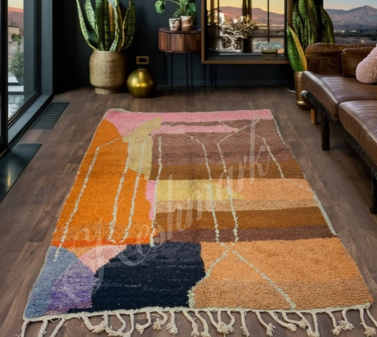 Made from 100% natural wool, this rug is luxuriously soft, cozy underfoot, and exceptionally durable. Its colorful palette makes it a standout piece, perfect for adding personality to modern, bohemian, eclectic, or contemporary spaces. Whether placed in a living room, bedroom, or creative studio, it instantly elevates the atmosphere with warmth and artistic flair.