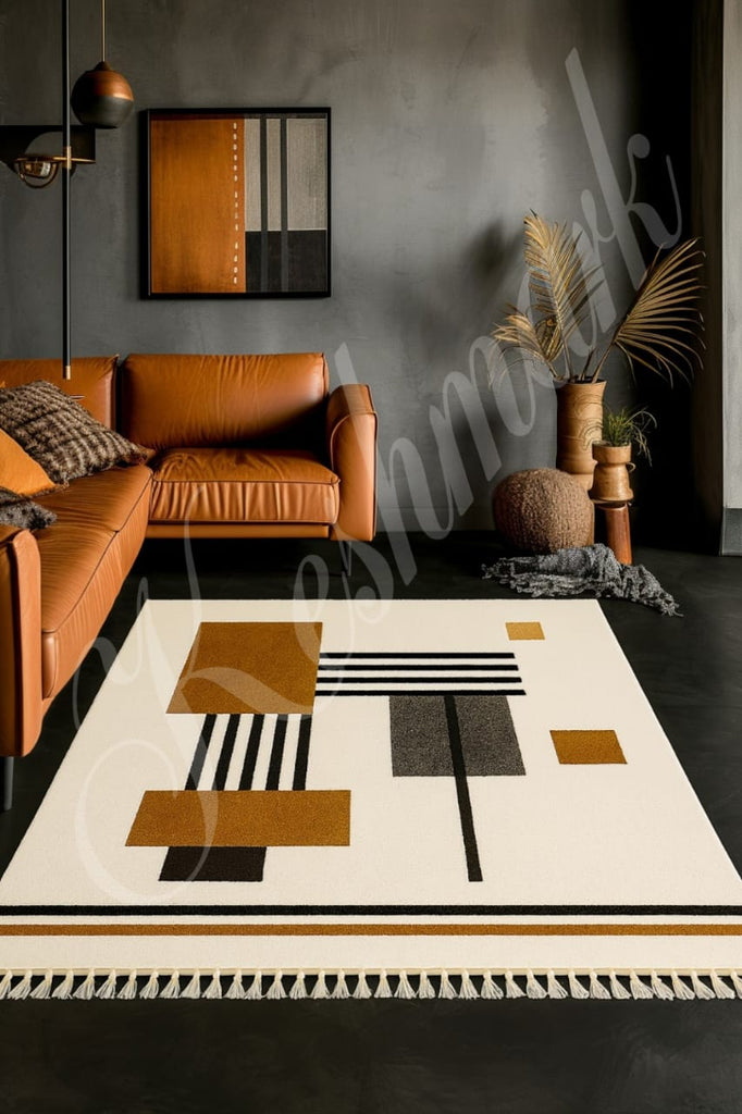Its modern abstract geometric design—featuring warm earthy tones, bold black lines, and textured shapes—beautifully blends contemporary minimalism with traditional Berber craftsmanship.