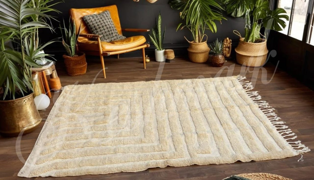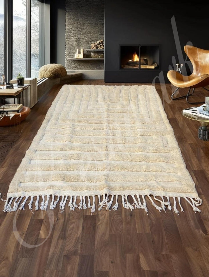 Handmade Moroccan Wool Rug – White Style Area Rug, Neutral Wool Carpet with Geometric 3D Design, Minimalist Home Decor