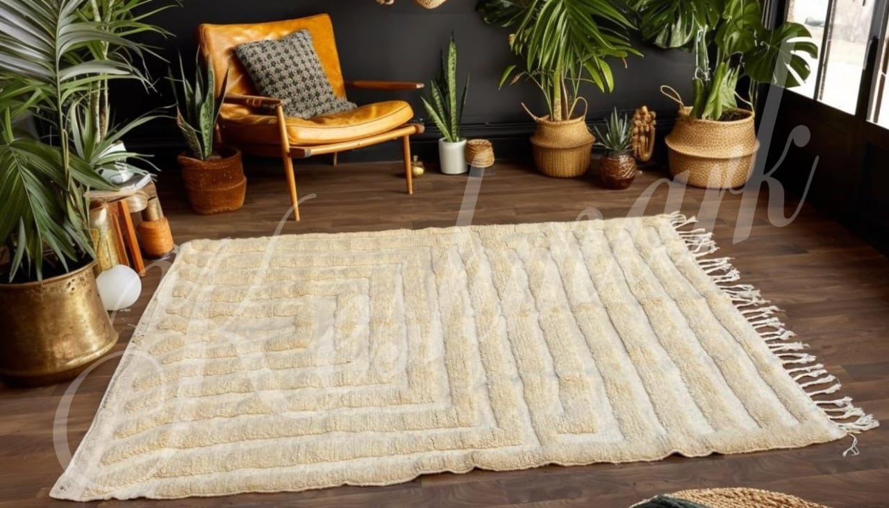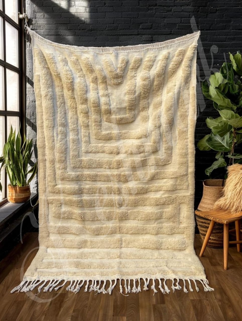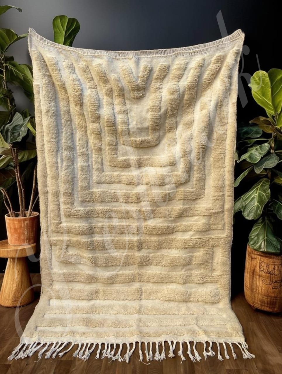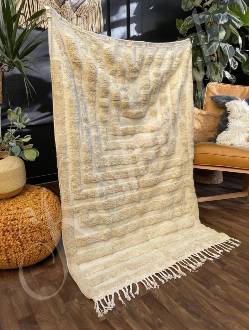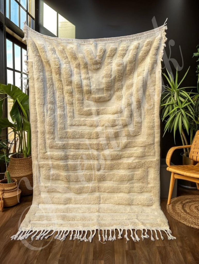 Expertly woven by Berber artisans in Morocco, it features a raised geometric pattern that adds a soft, 3D texture—bringing depth, warmth, and sophistication to any room.