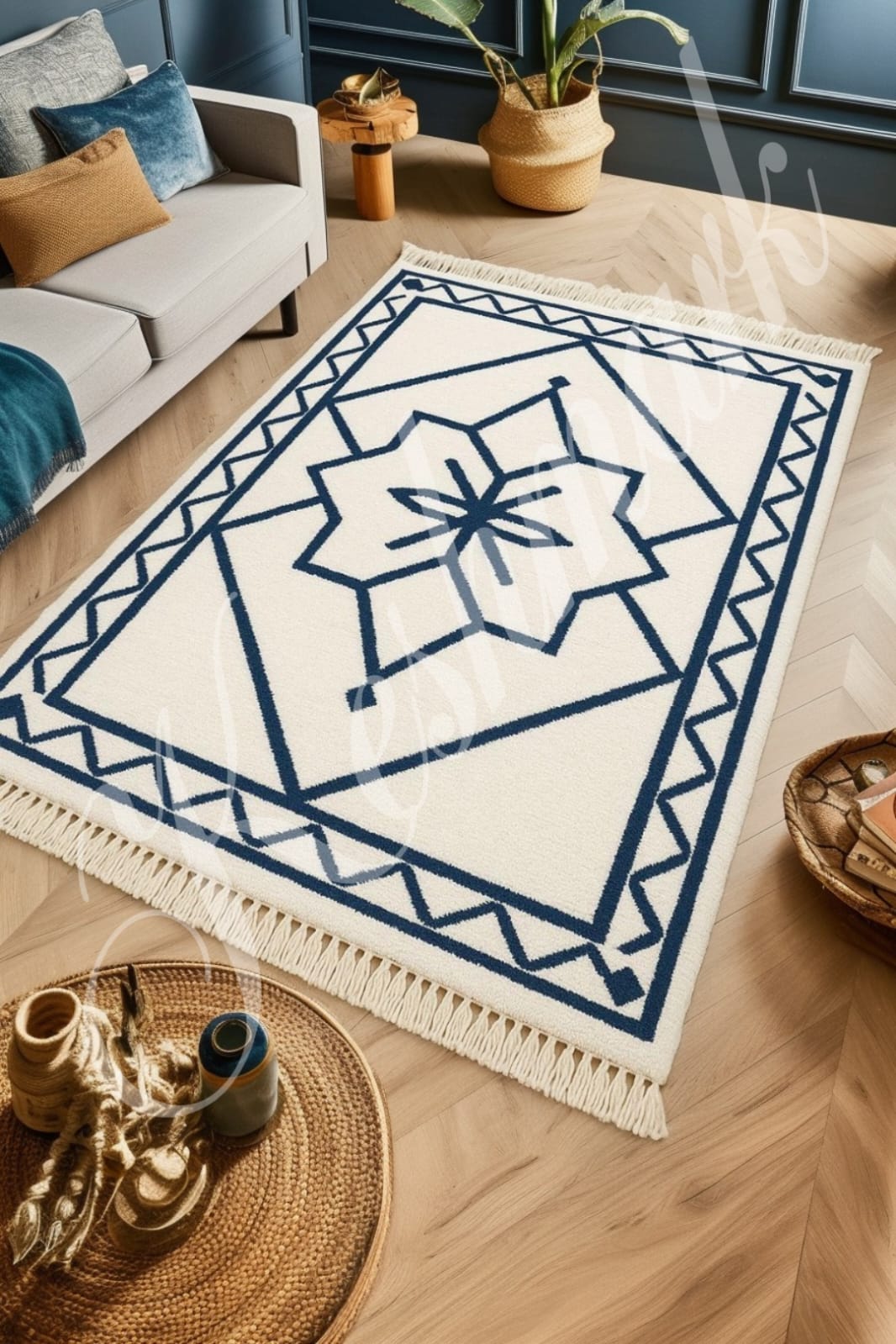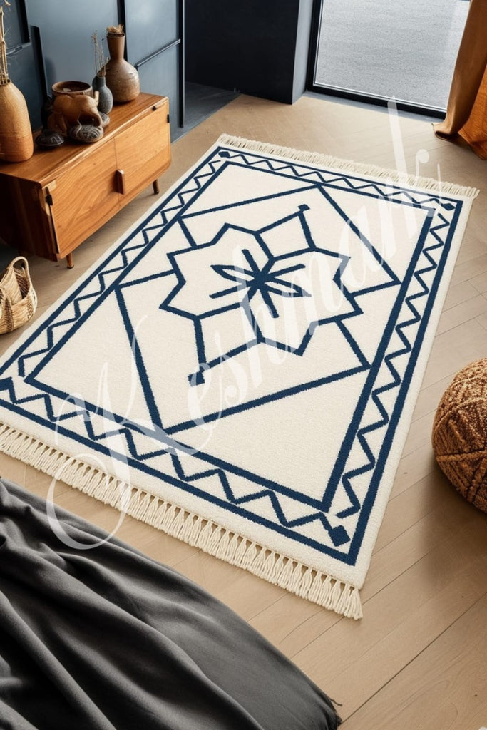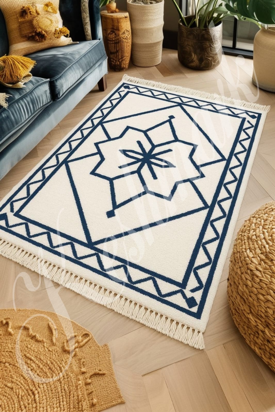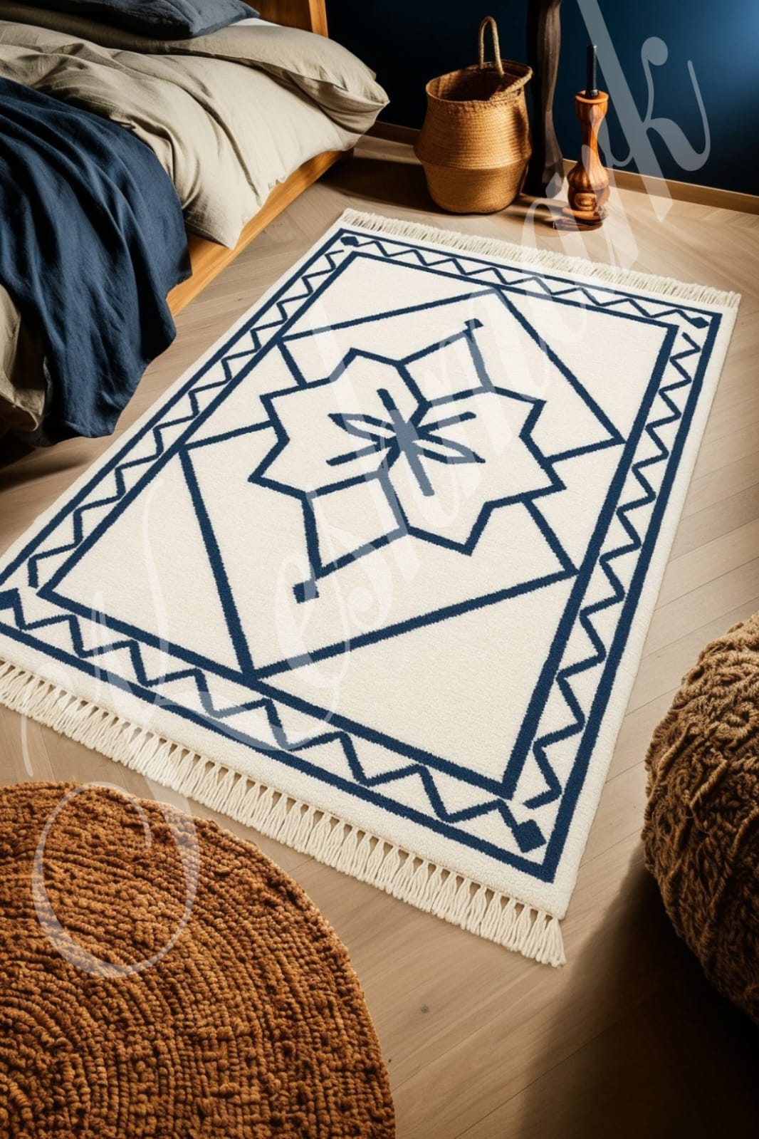 Its crisp lines and distinctive central motif make it an ideal statement rug for bedrooms, living rooms, salons, offices, and modern boho spaces.
