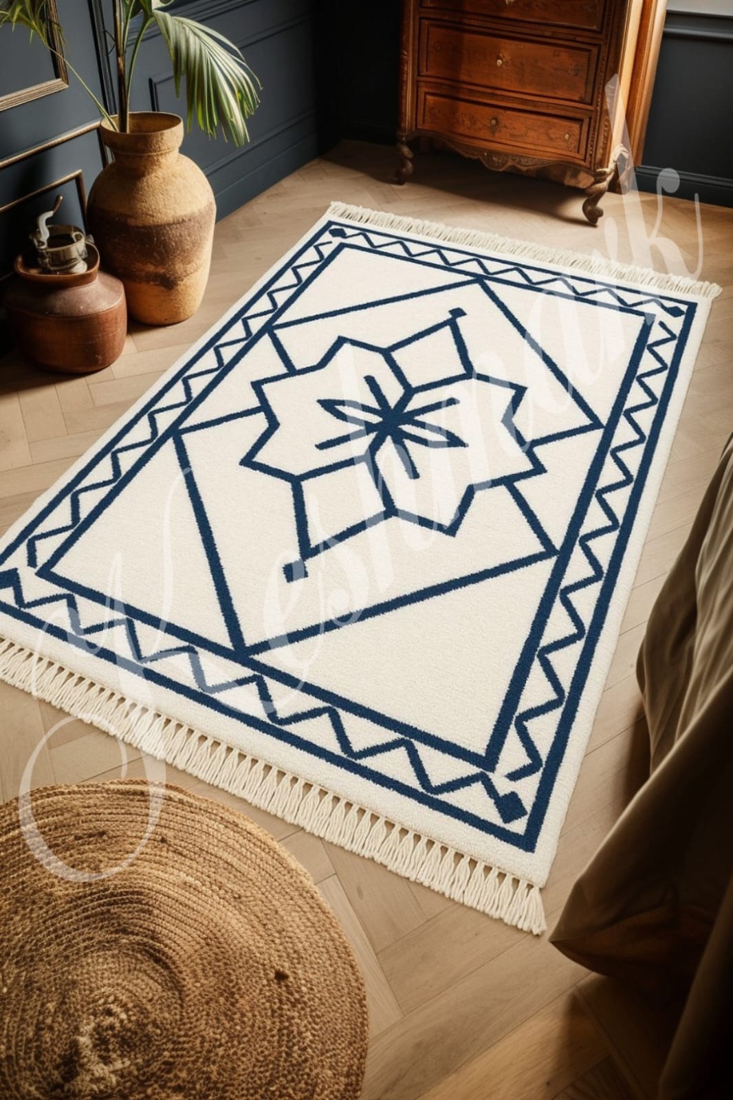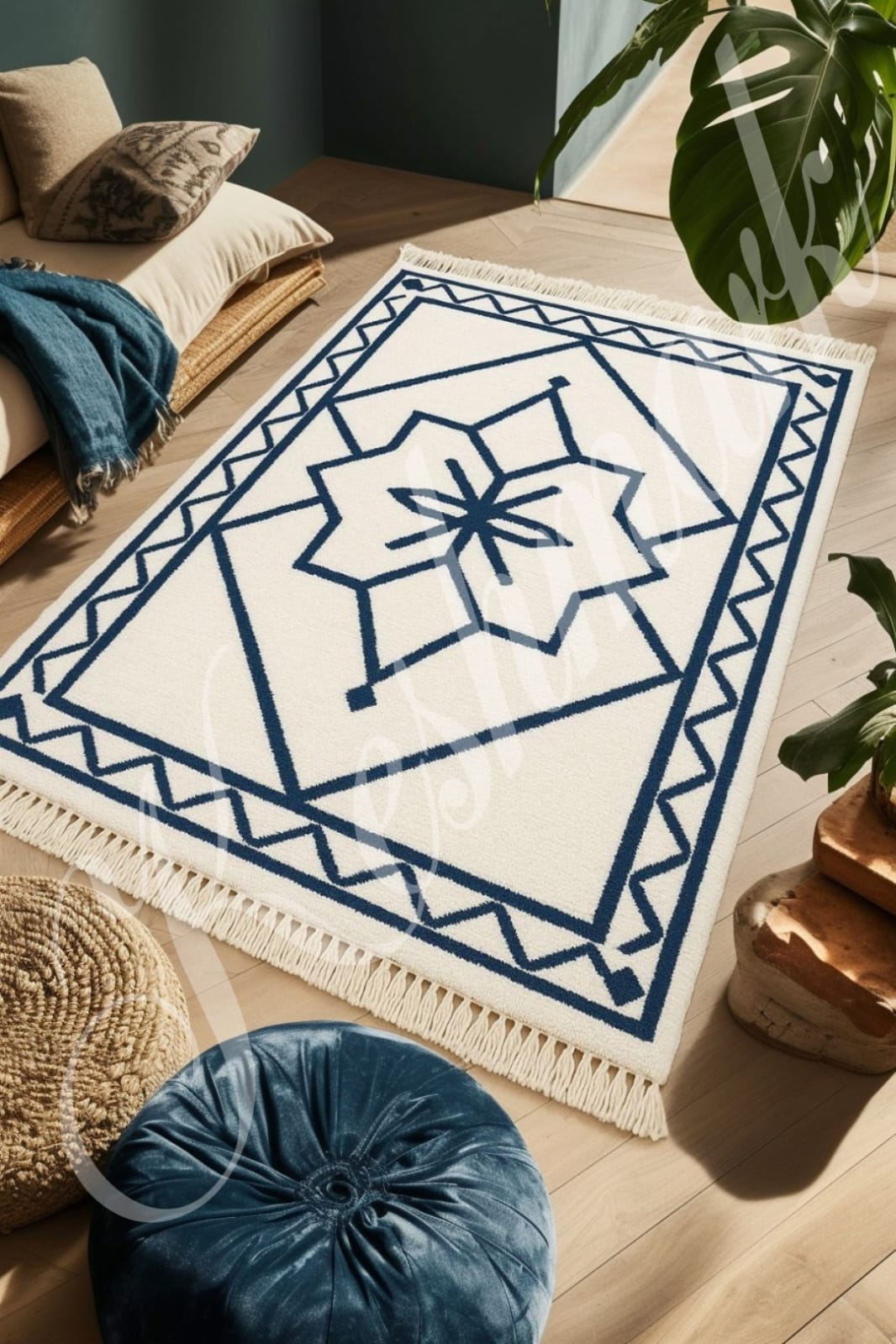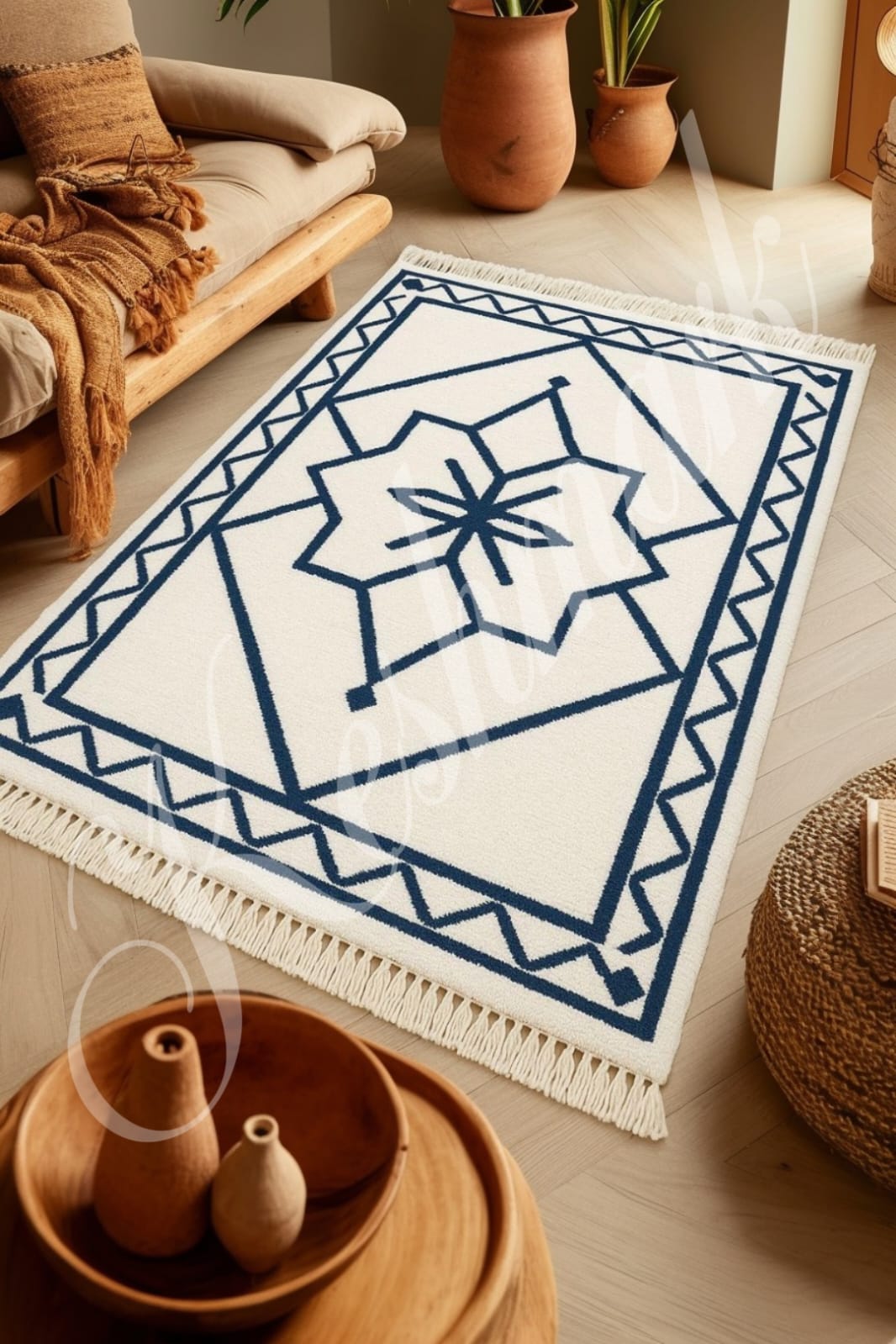 Its crisp lines and distinctive central motif make it an ideal statement rug for bedrooms, living rooms, salons, offices, and modern boho spaces.