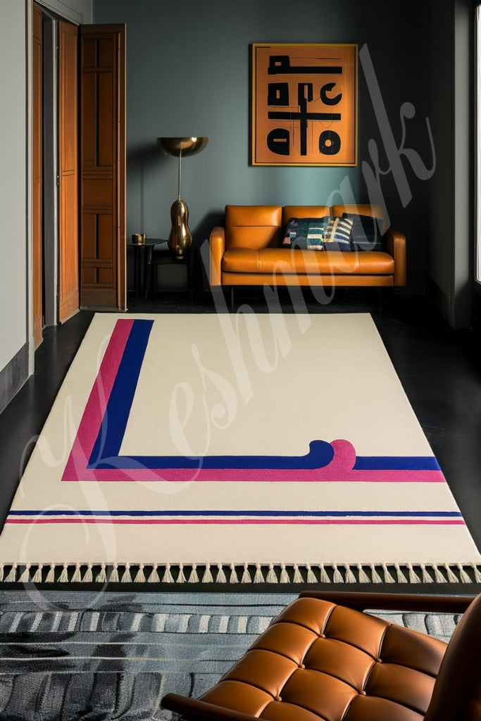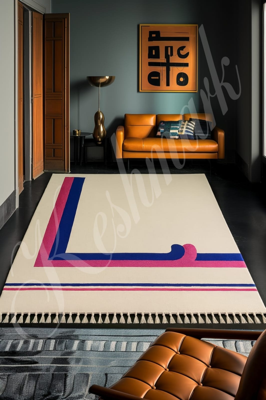 Featuring a striking blend of terracotta orange, deep blue, and crisp geometric linework on a soft cream background, this rug seamlessly merges Berber heritage with modern minimalist design.