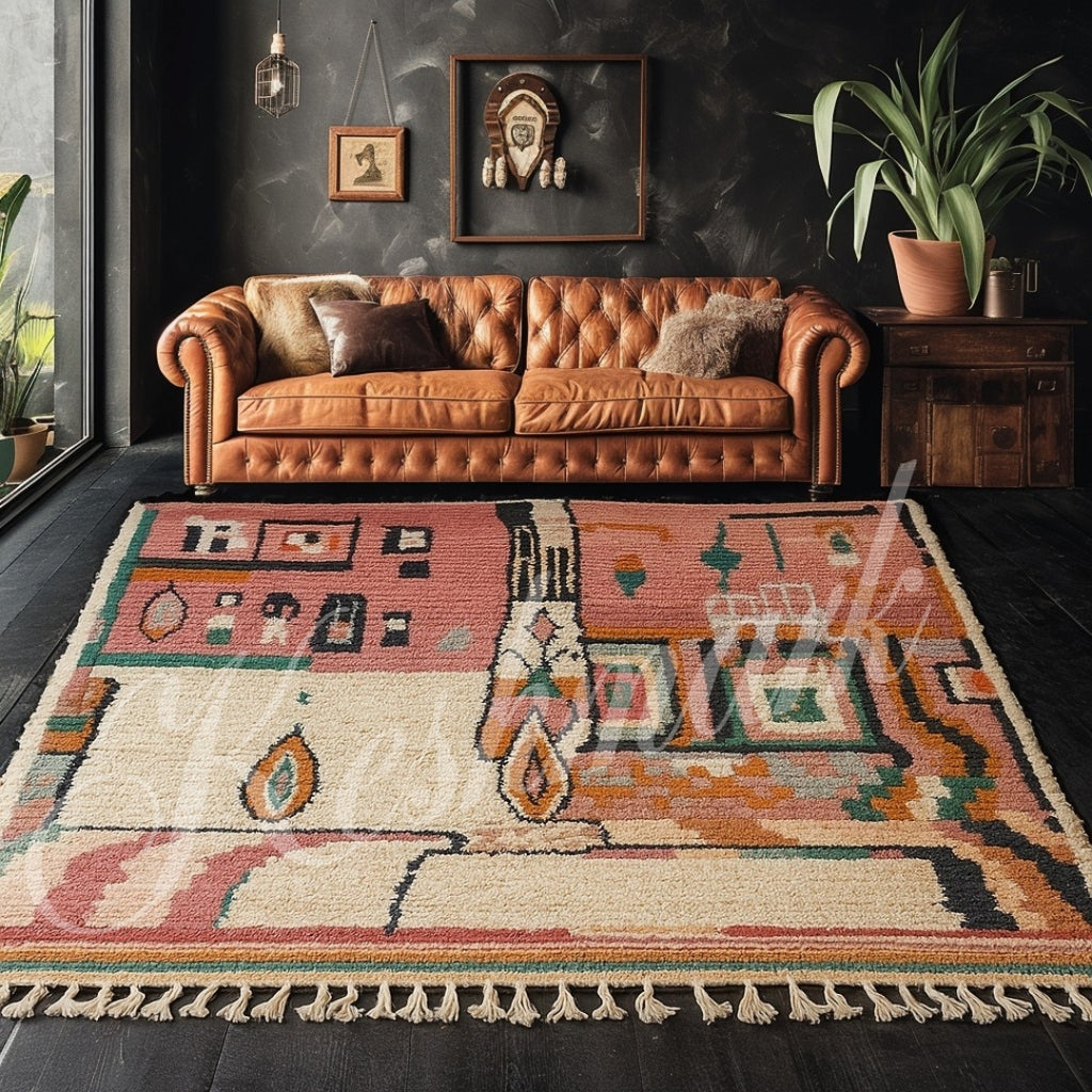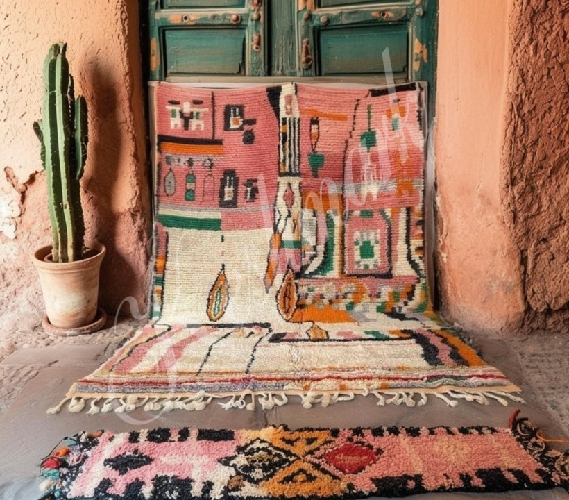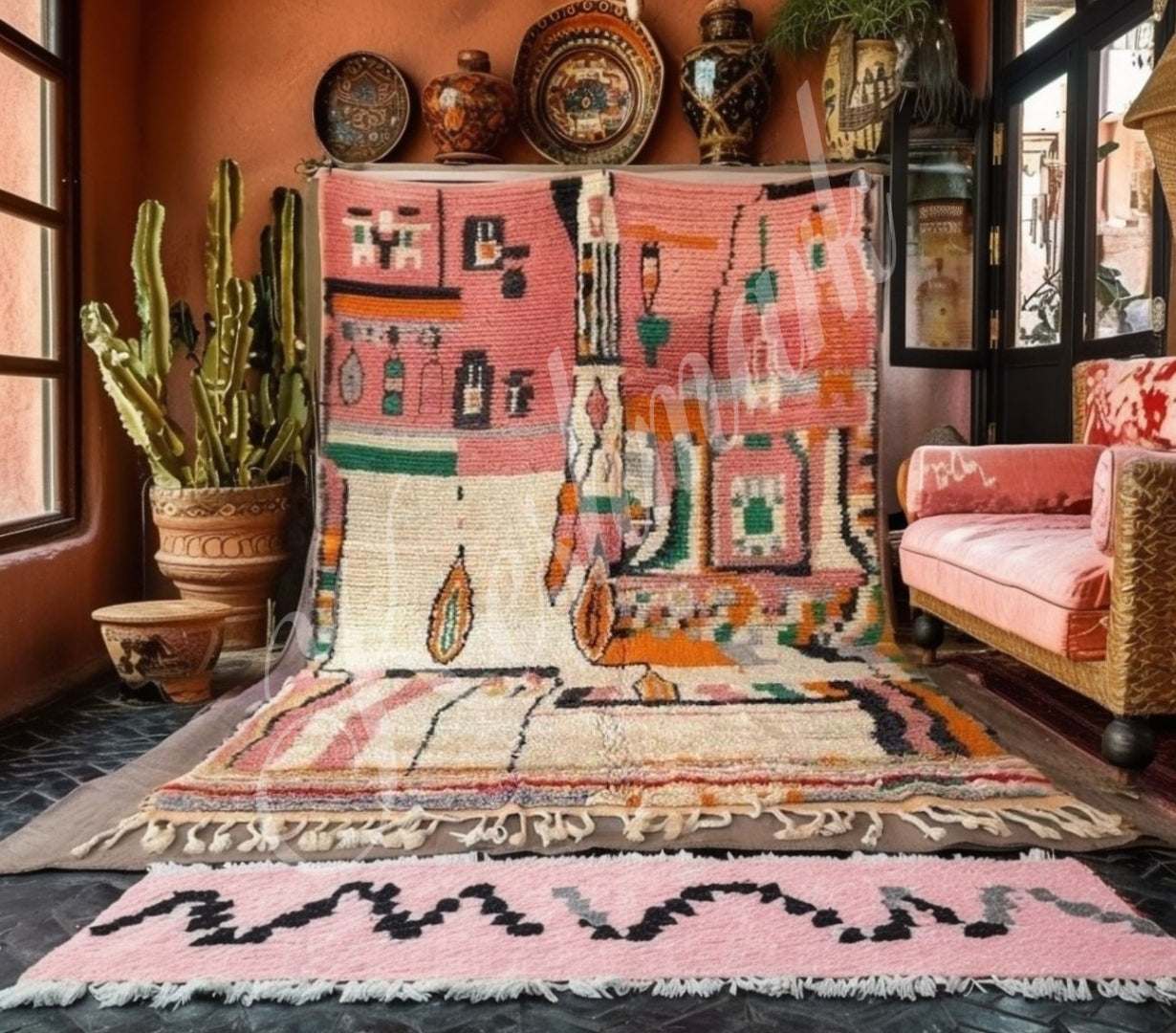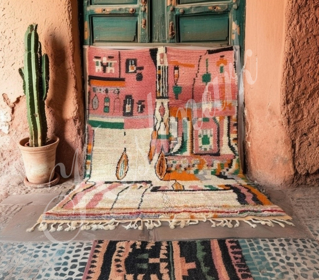 Bring color, warmth, and authentic Moroccan craftsmanship into your home with this handmade Boucherouite rug, skillfully woven by Berber women using traditional techniques. Featuring a vibrant mix of pink, orange, green, cream, and earthy tones, the rug creates a striking abstract composition inspired by Moroccan village life and traditional Berber symbols.