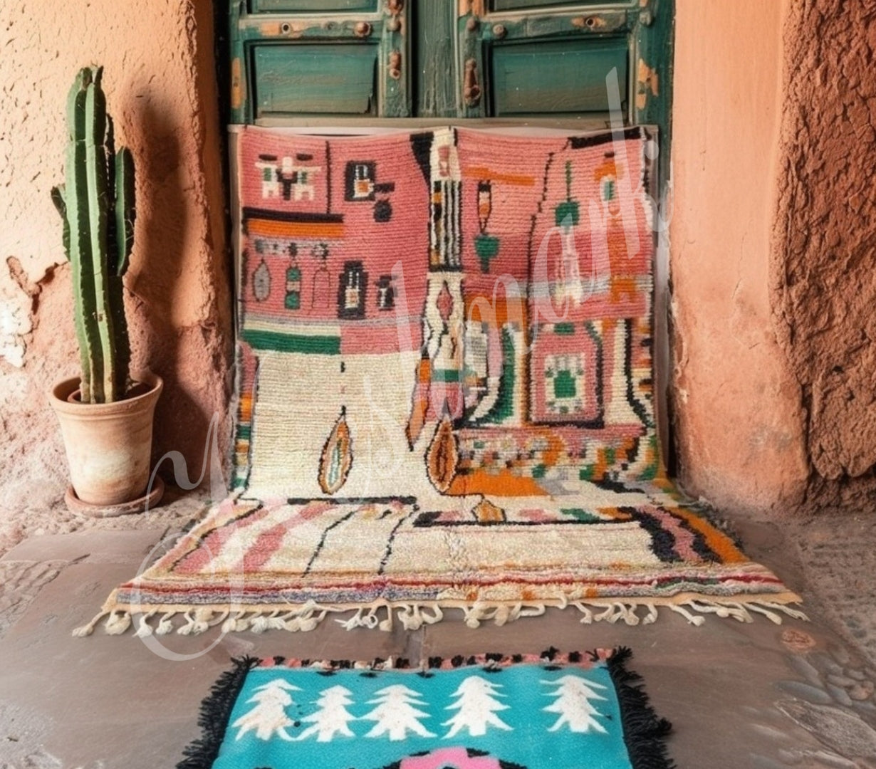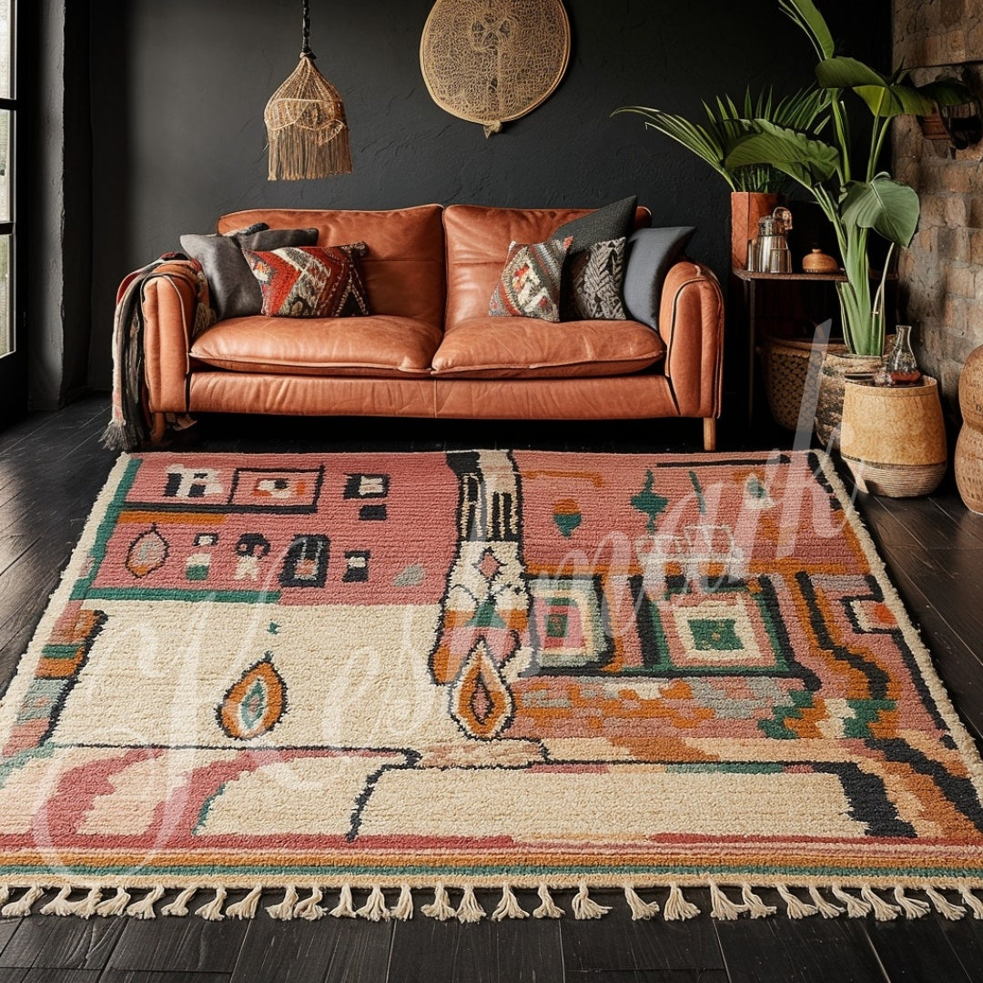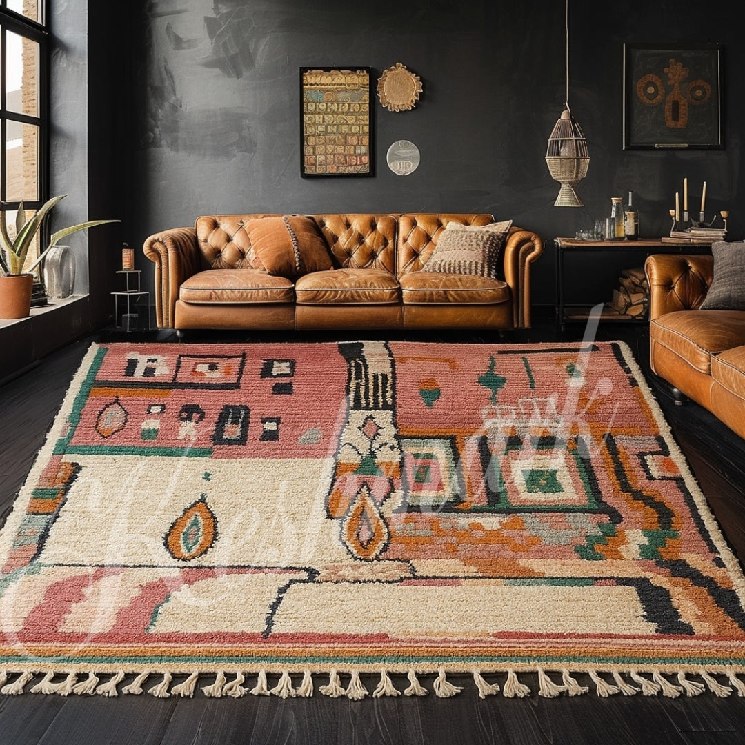 Bring color, warmth, and authentic Moroccan craftsmanship into your home with this handmade Boucherouite rug, skillfully woven by Berber women using traditional techniques. Featuring a vibrant mix of pink, orange, green, cream, and earthy tones, the rug creates a striking abstract composition inspired by Moroccan village life and traditional Berber symbols.