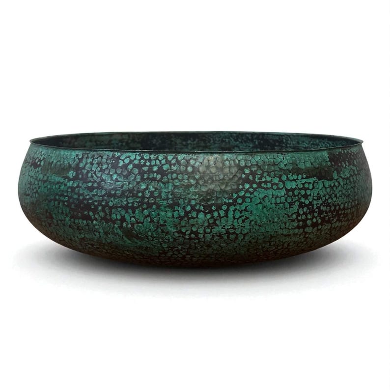 The rich patina tones and hammered finish make it a functional work of art for farmhouse, vintage, rustic, or Moroccan-inspired bathrooms.