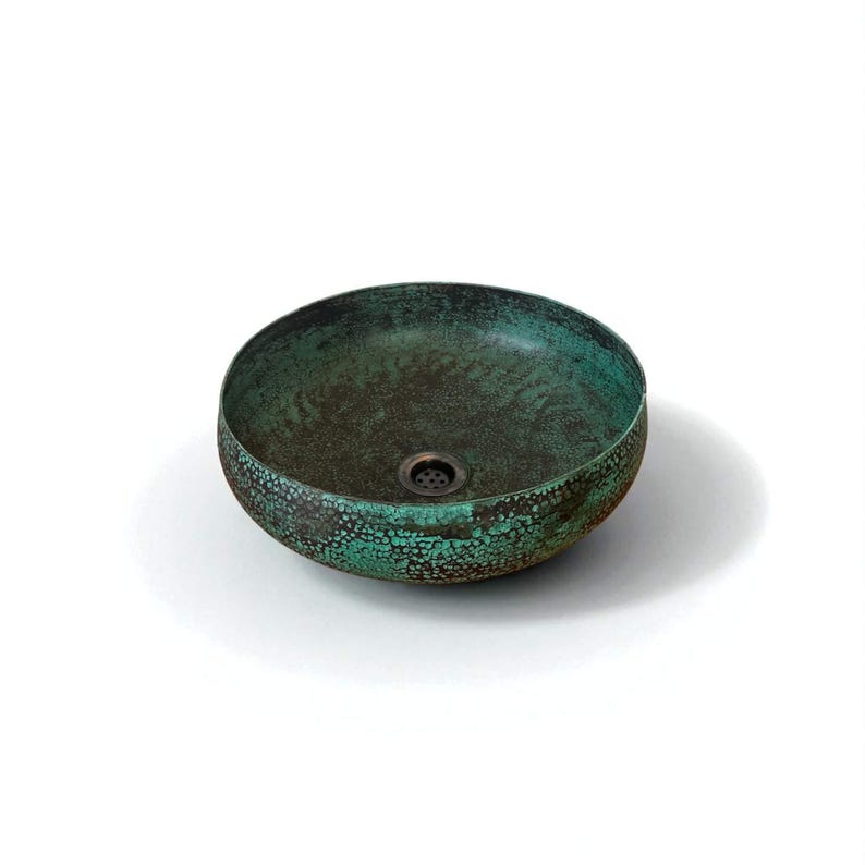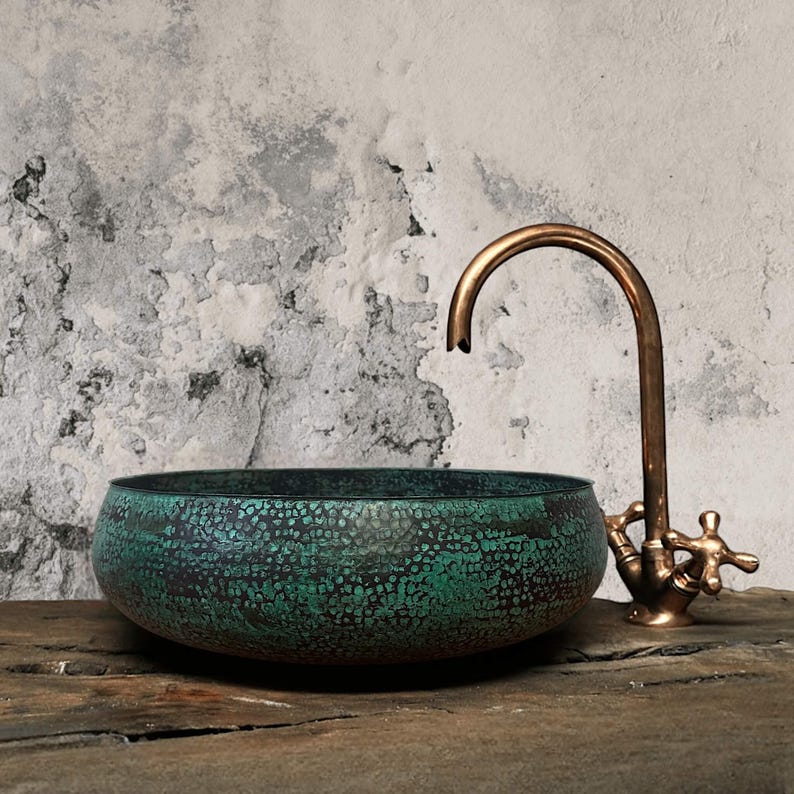 Handmade Oxidized Copper Bathroom Sink β Rustic Green Patina Round Vessel Basin for Farmhouse Decor