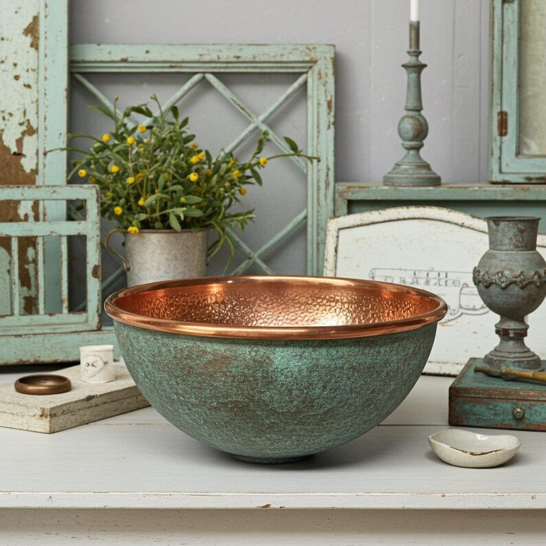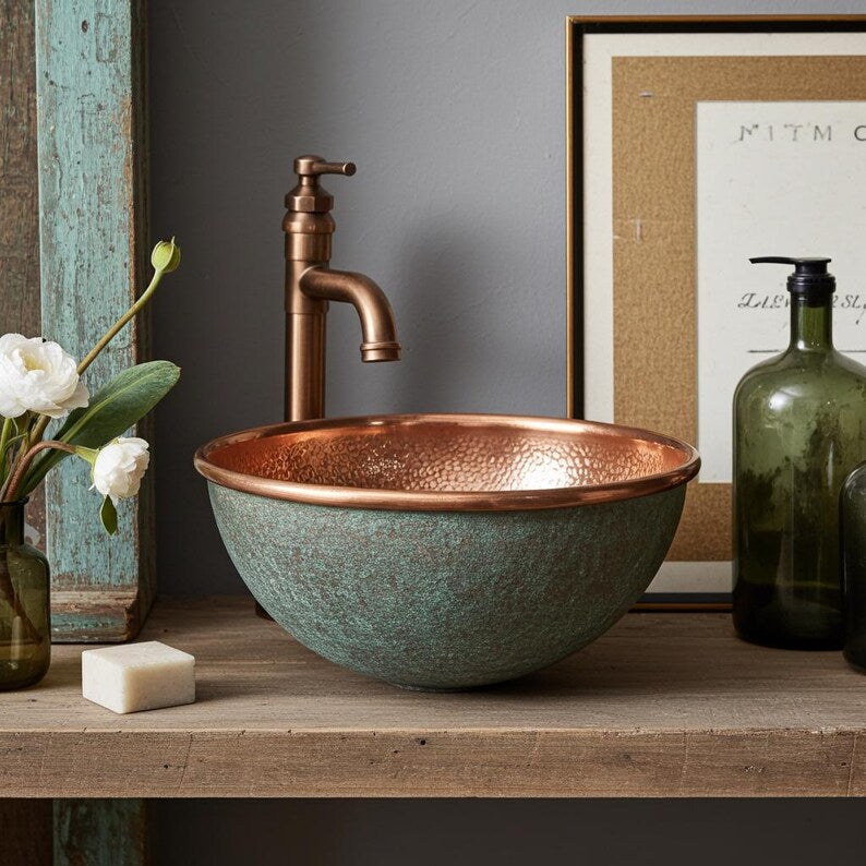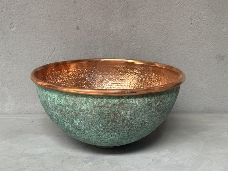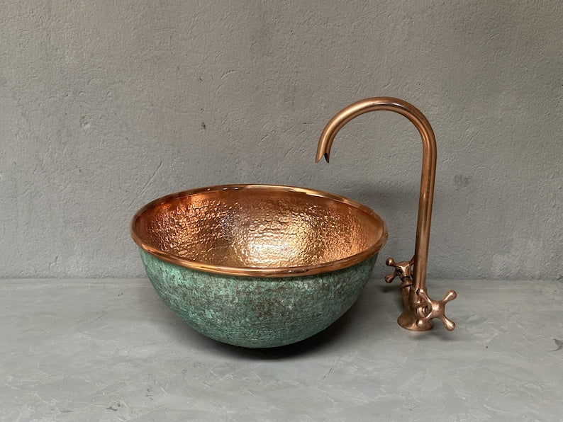 Handmade Oxidized Copper Vessel Sink: Green Patina Bathroom Decor