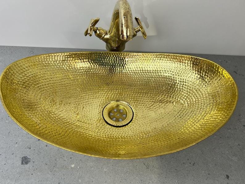 Handmade Unlacquered Brass Oval Sink – Moroccan Hammered Vessel Basin | Artisan Solid Brass Bathroom Bowl