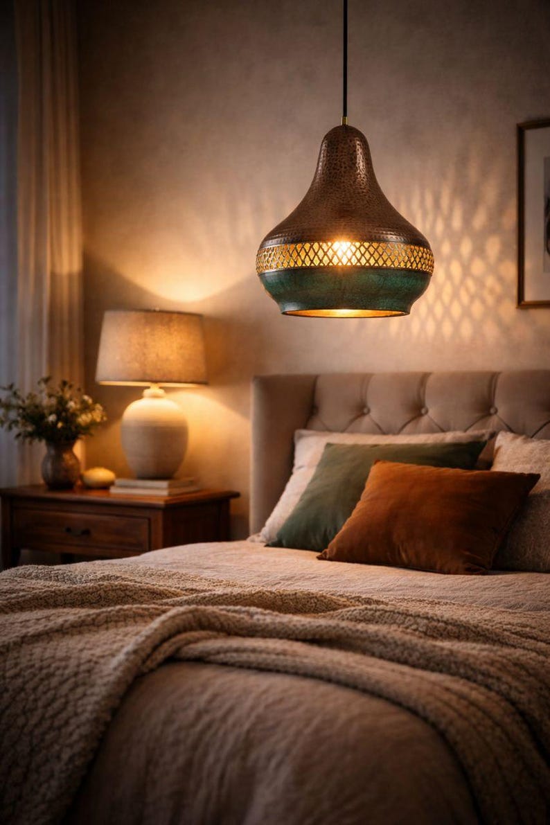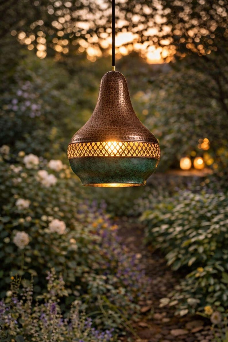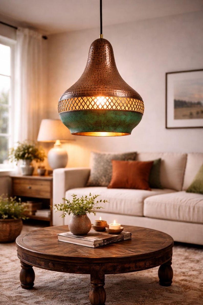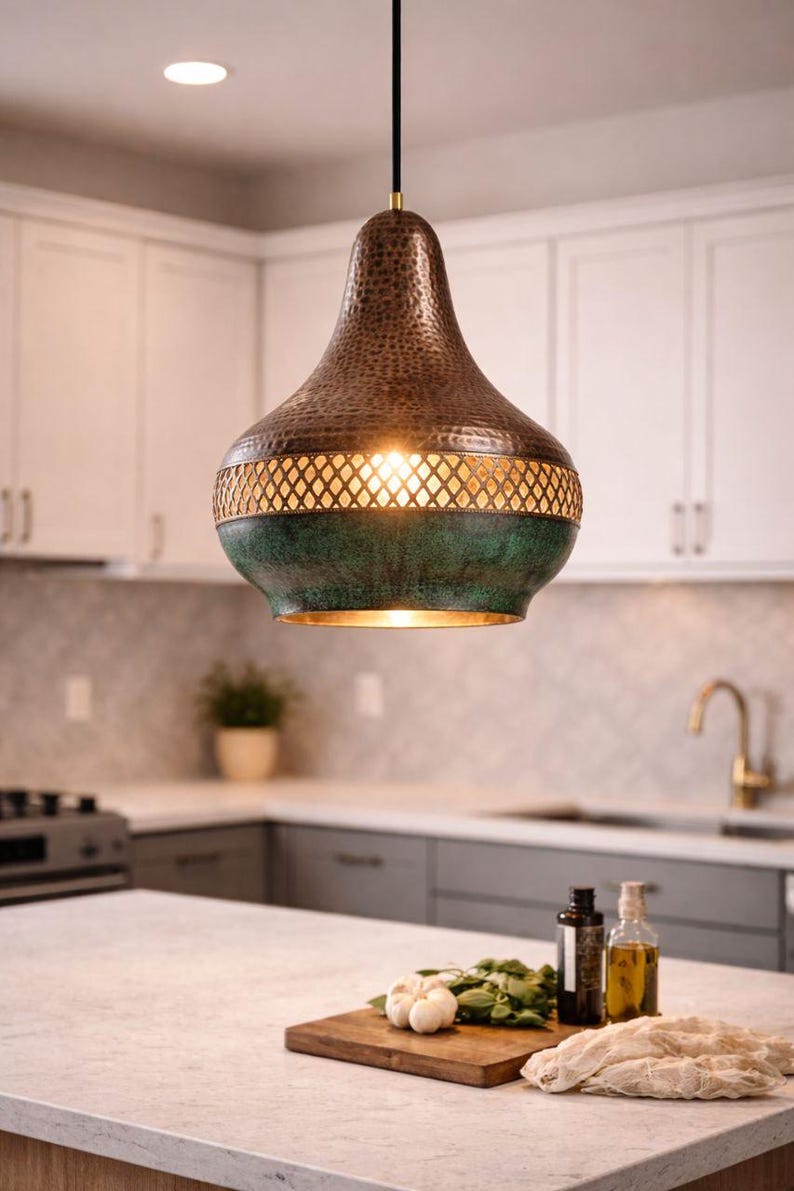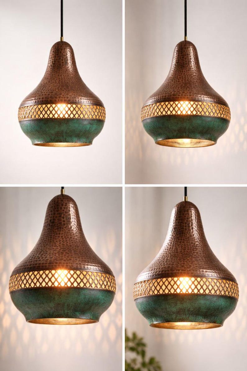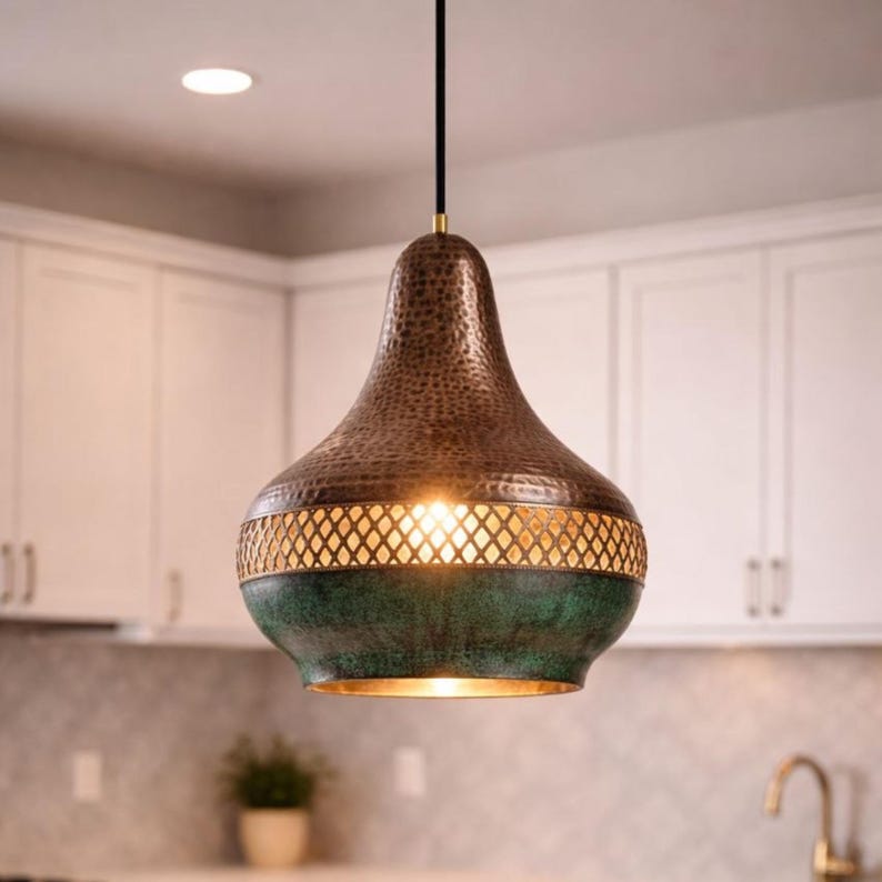 Designed for lower ceilings or compact spaces, this fixture sits close to the ceiling while still making a bold statement. The naturally aged green and copper tones create a unique, organic finish, while the hammered interior reflects a soft, warm glow that enhances any room.
