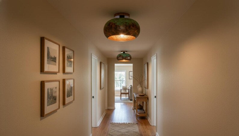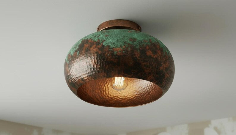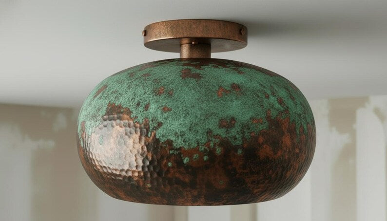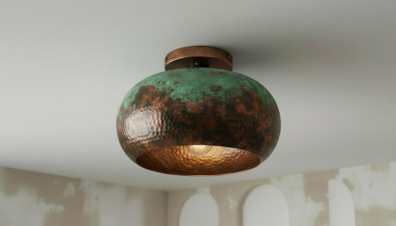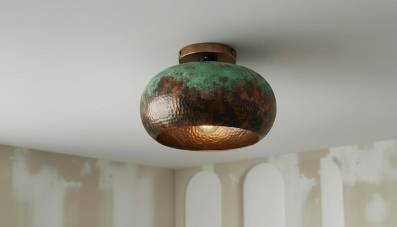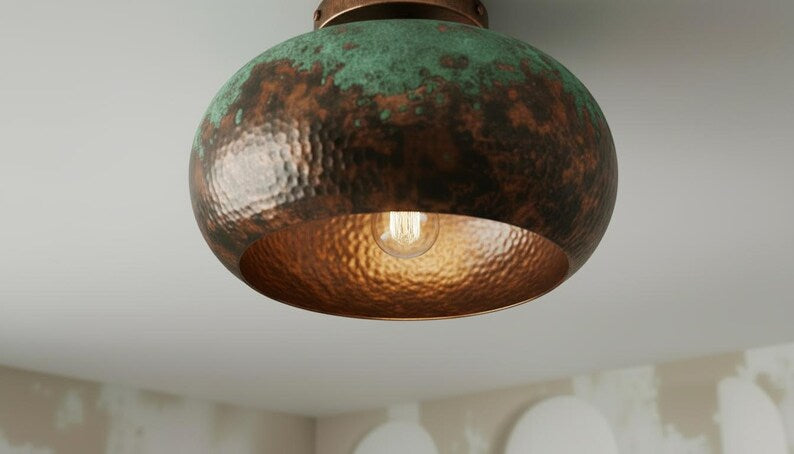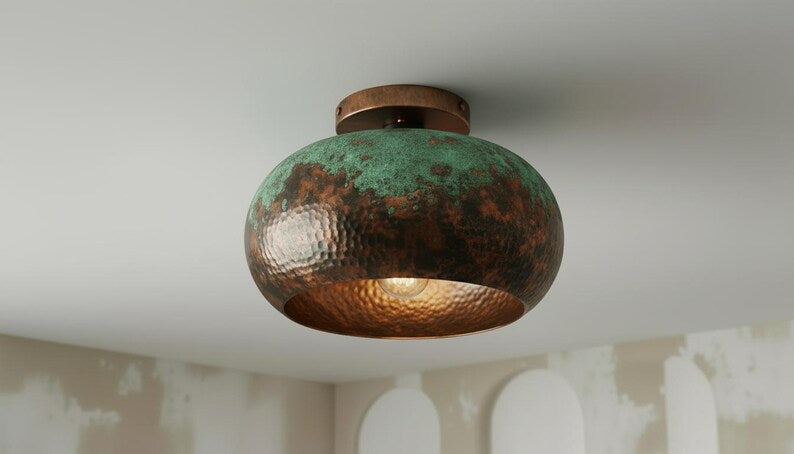 Designed for lower ceilings or compact spaces, this fixture sits close to the ceiling while still making a bold statement. The naturally aged green and copper tones create a unique, organic finish, while the hammered interior reflects a soft, warm glow that enhances any room.