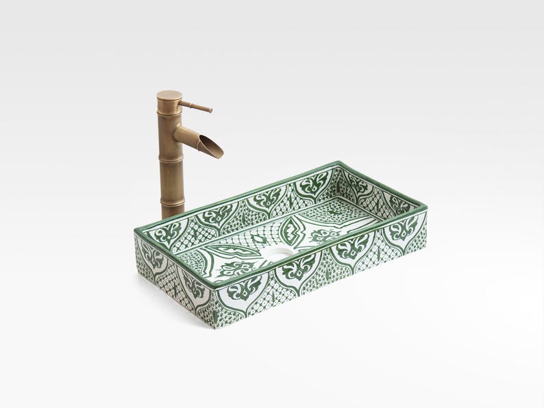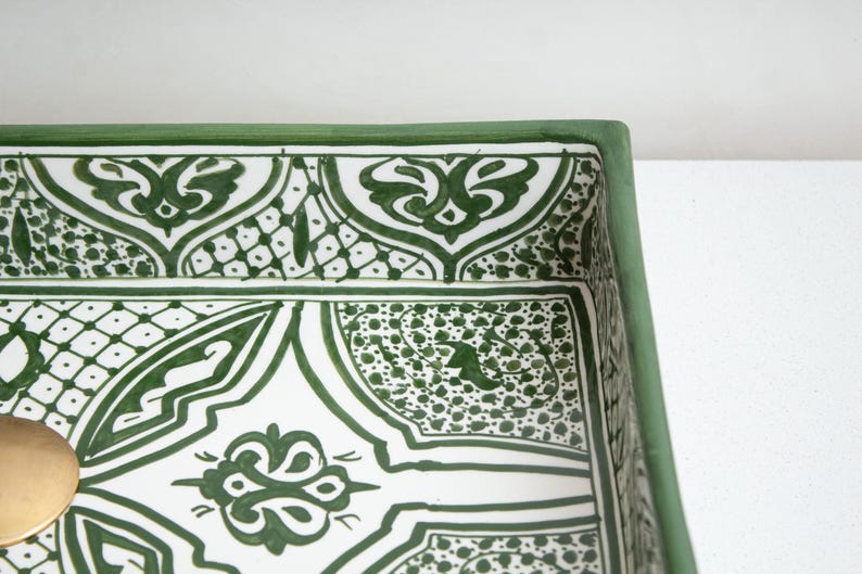 Ceramic washbasin featuring intricate Moroccan patterns in forest green and white. Geometric lattice work combines with floral motifs across the interior and exterior surfaces. Central drain opening surrounded by symmetrical design elements.